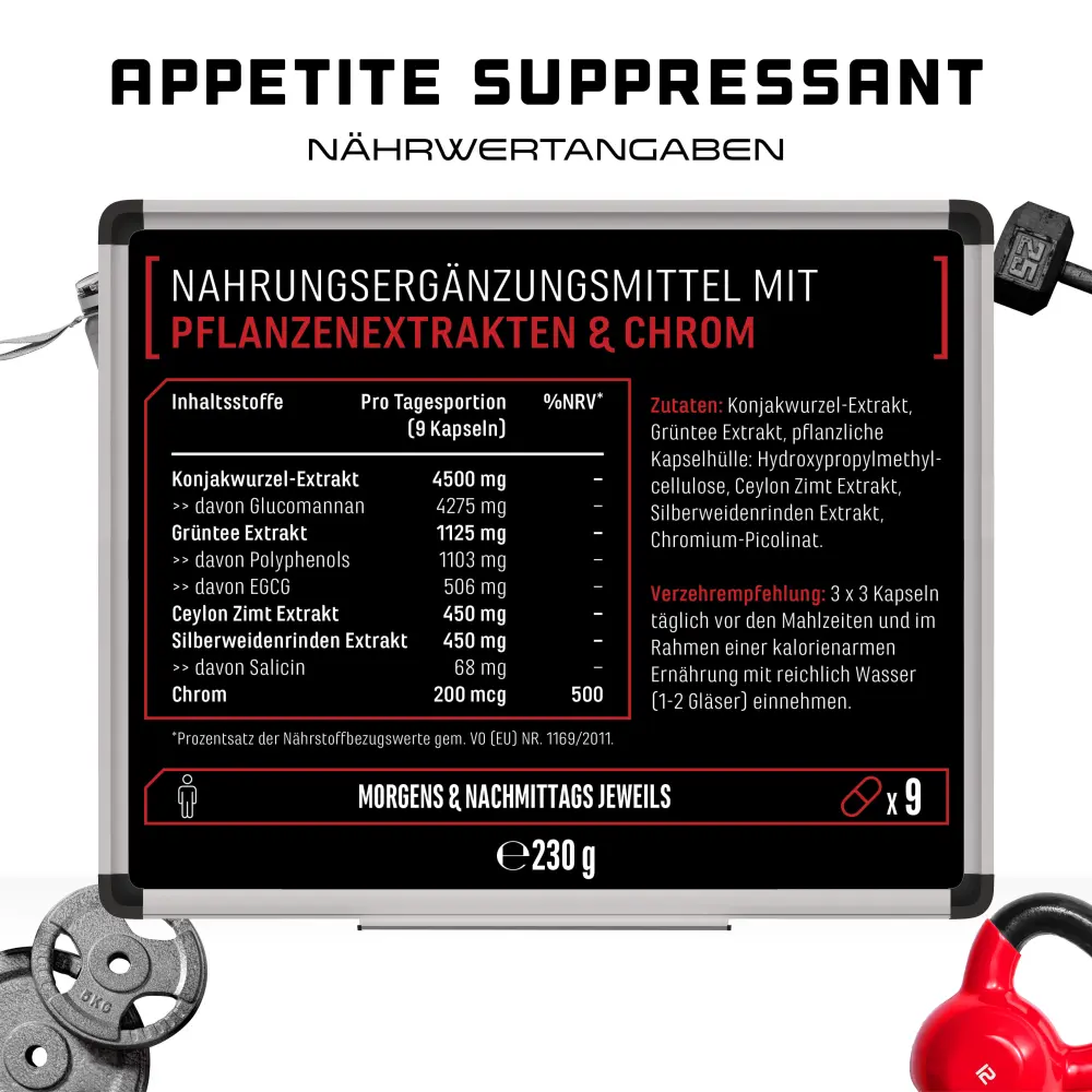 Konjac root extract, green tea extract, coating agent: hydroxypropyl methylcellulose (vegetable), Ceylon cinnamon extract, white willow bark extract, chromium picolinate.