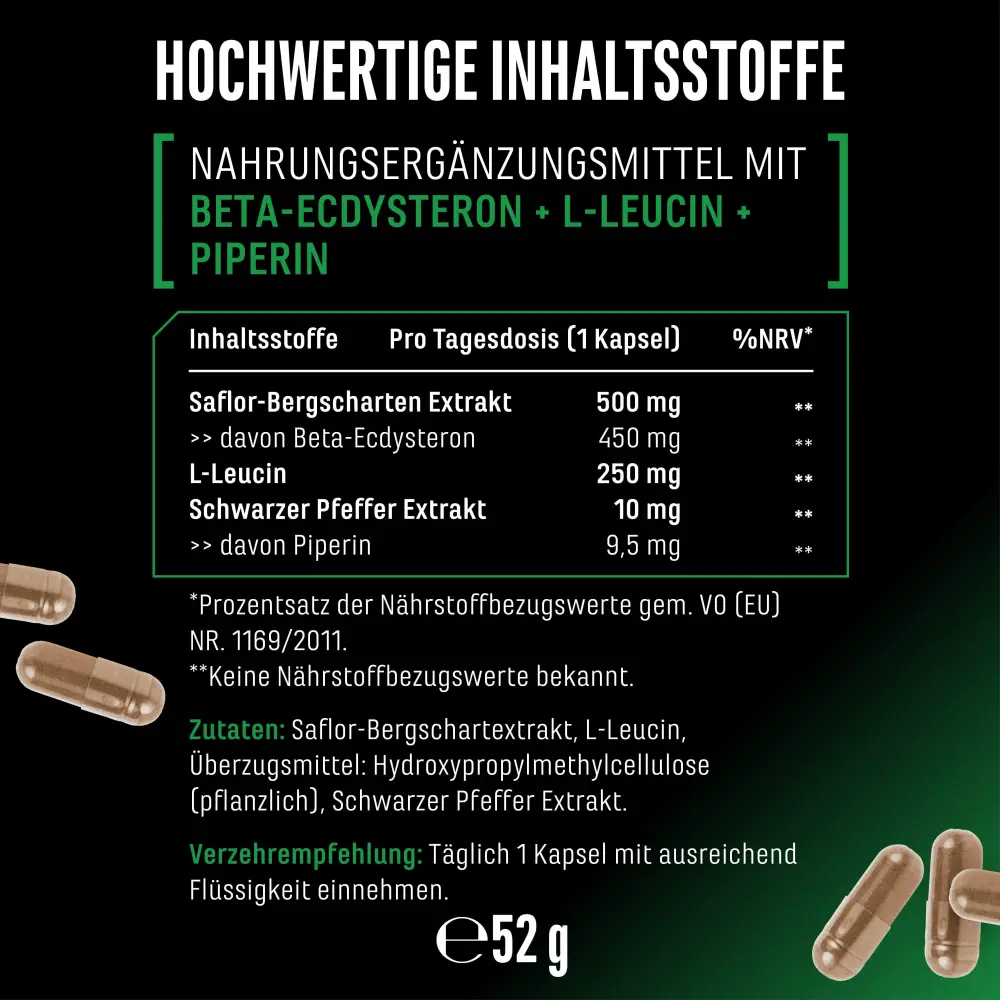 Safflower seed extract, L-leucine, coating agent: hydroxypropyl methylcellulose (vegetable), black pepper extract.