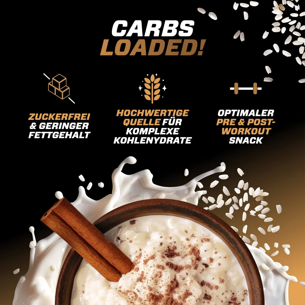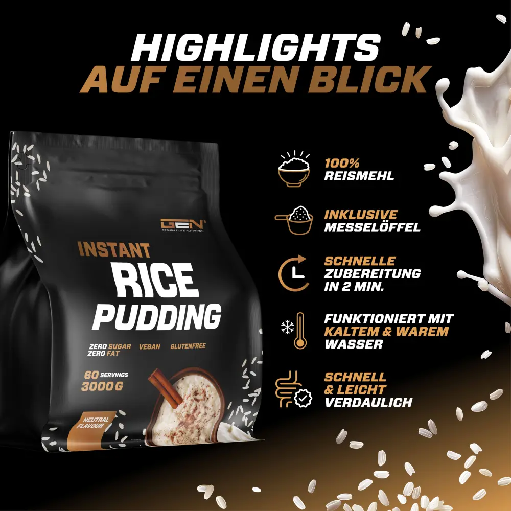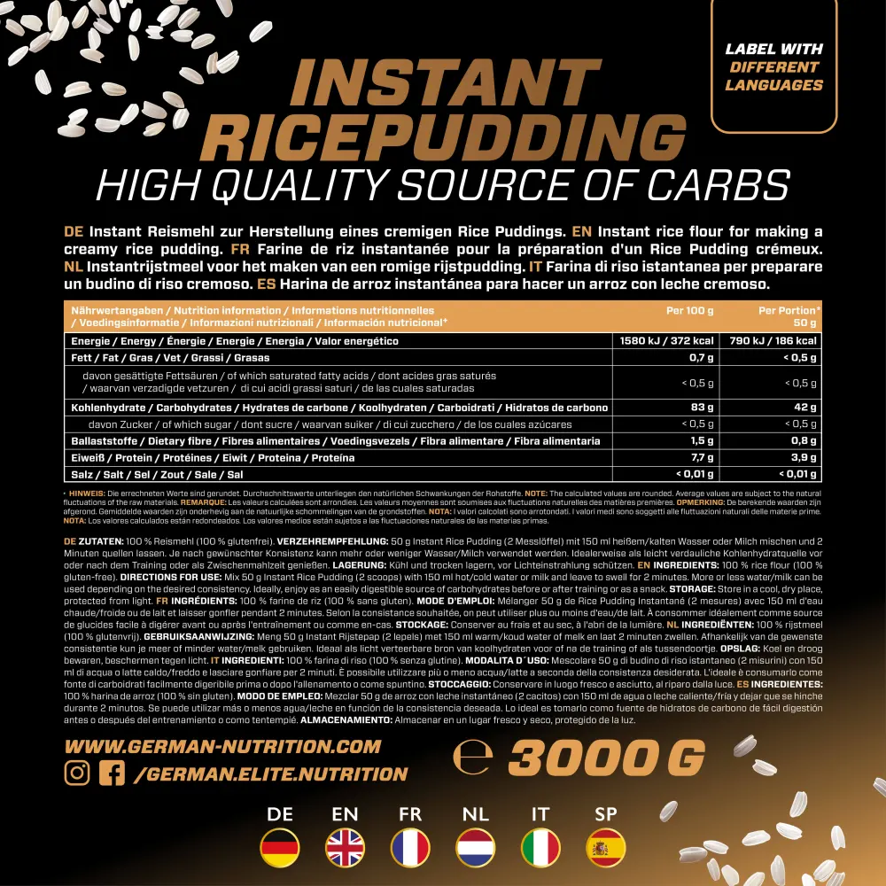Mix 50 g rice pudding (2 measuring spoons) with cold/hot water or milk and leave to soak for 2 minutes.