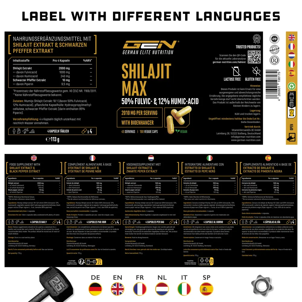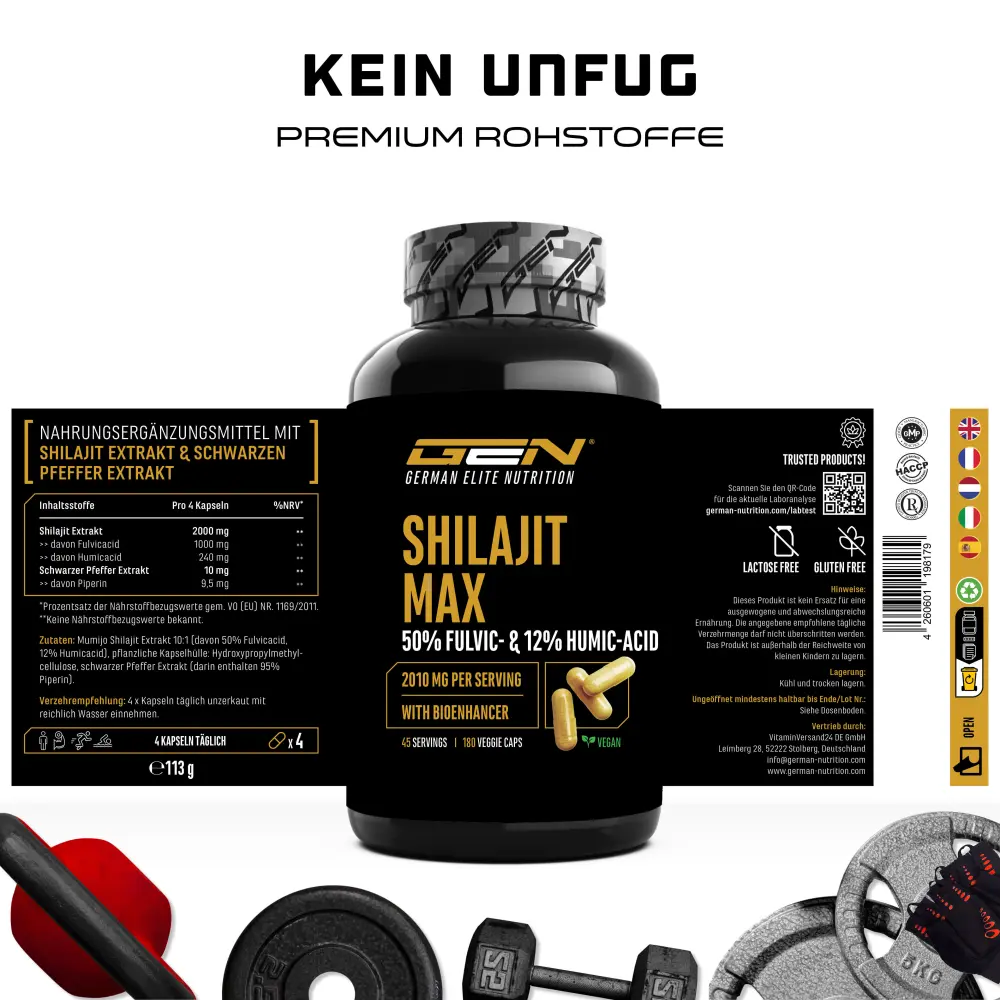 Mumijo Shilajit extract 10:1 (50% fulvic acid, 12% humic acid), coating agent: hydroxypropyl methylcellulose (vegetable), black pepper extract (95% piperine).