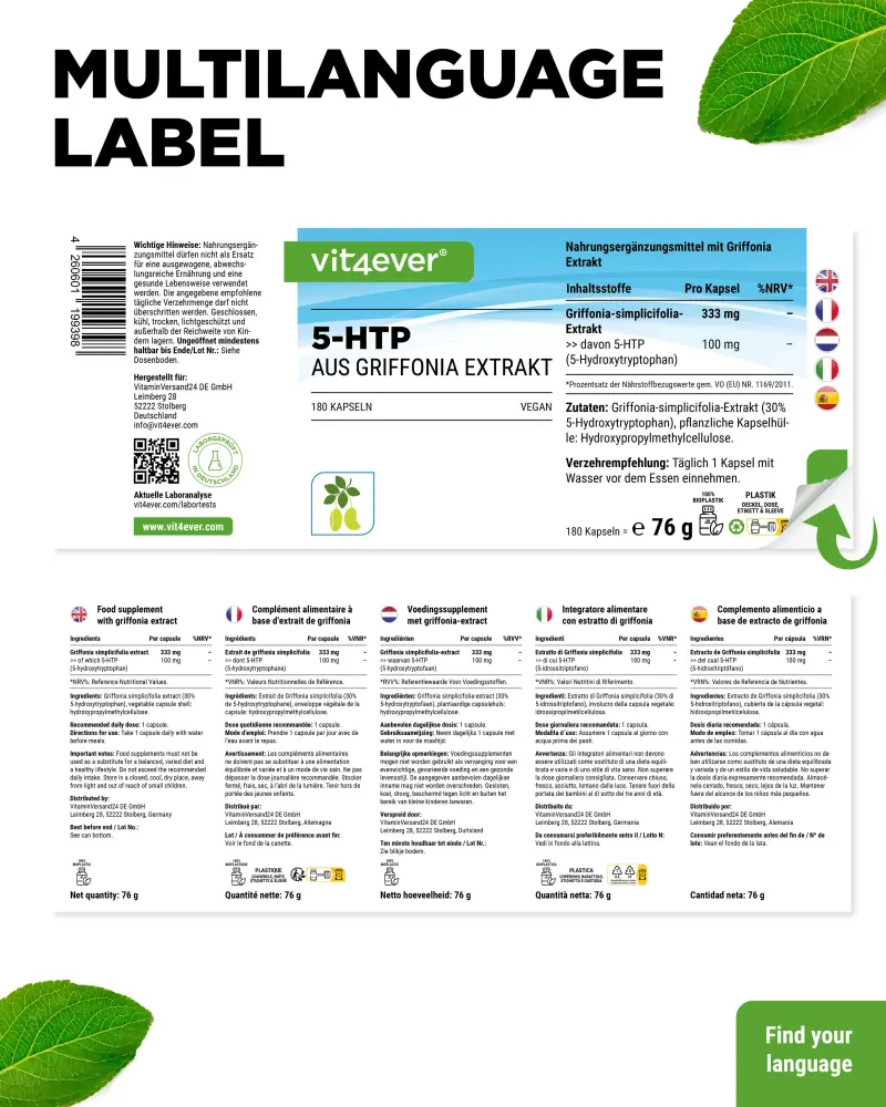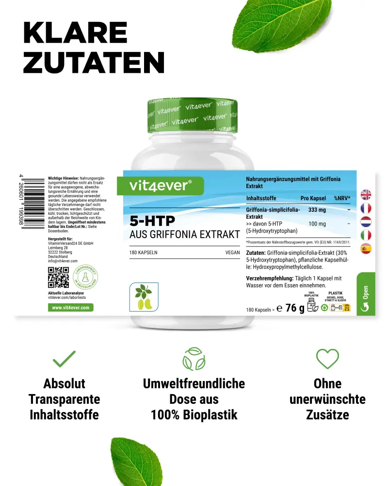 Griffonia simplicifolia extract (30% 5-hydroxytryptophan), coating agent: hydroxypropyl methylcellulose (plant-based).