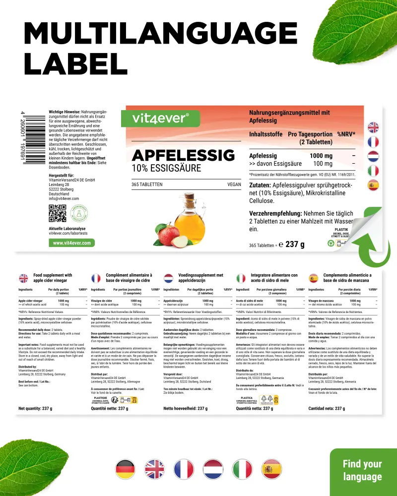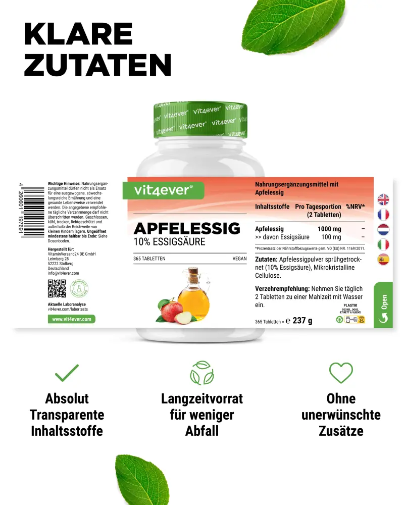 Spray-dried apple cider vinegar powder (10% acetic acid), microcrystalline cellulose.