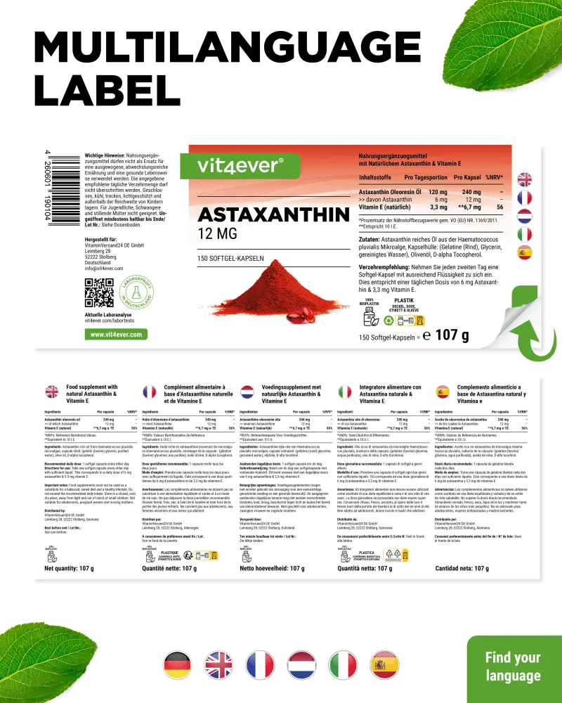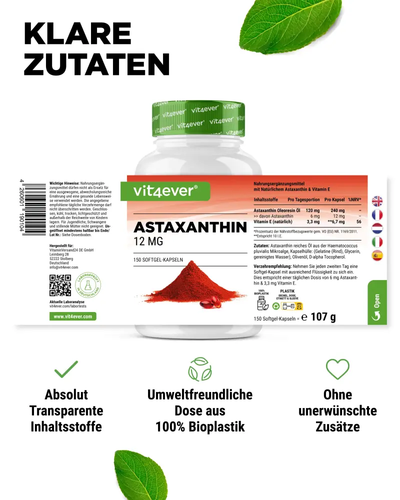 It is produced by algae, in particular the microalgae Haematococcus pluvialis, which also forms the basis for this product.