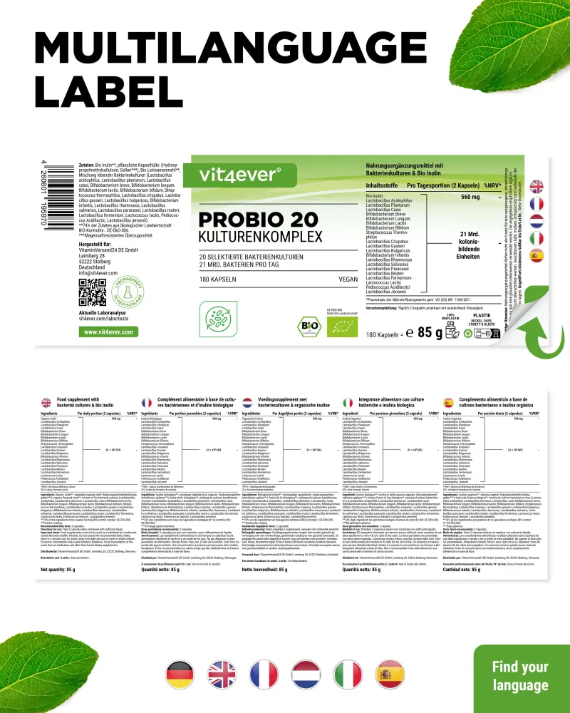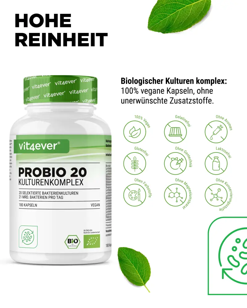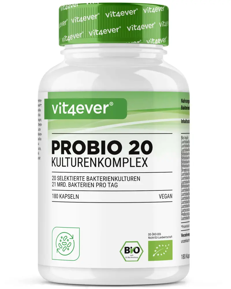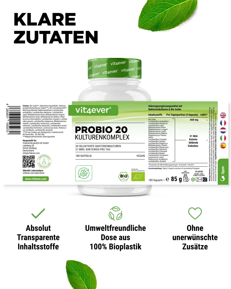 Bio Inulin**, Überzugsmittel (JC CAPS): Hydroxypropylmethylcellulose (pflanzlich), Gellan, Bio Leinsamenmehl**, Mischung lebender Bakterienkulturen (Lactobacillus acidophilus, Lactobacillus plantarum, Lactobacillus casei, Bifidobacterium breve, Bifidobacterium longum, Bifidobacterium lactis, Bifidobacterium bifidum, Streptococcus thermophilus, Lactobacillus crispatus, Lactobacillus gasseri, Lactobacillus bulgaricus, Bifidobacterium infantis, Lactobacillus rhamnosus, Lactobacillus salivarius, Lactobacillus paracasei, Lactobacillus reuteri, Lactobacillus fermentum, Lactococcus lactis, Pediococcus Acidilactic, Lactobacillus jensenii). **74% der Zutaten aus ökologischer Landwirtschaft BIO-Kontrollnr.: DE-ÖkO-006.