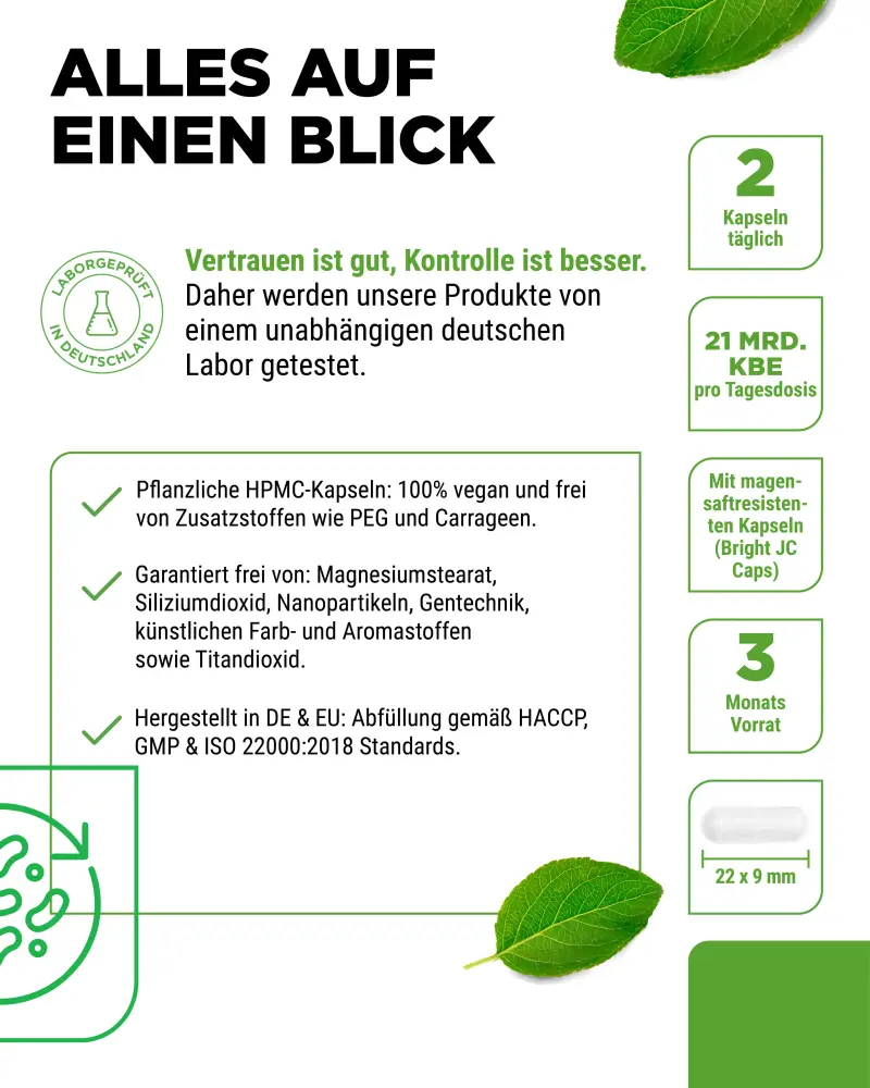 The use of enteric-coated capsules (Bright JC Caps) ensures that the bacteria arrive undamaged where they are needed – in the intestine.