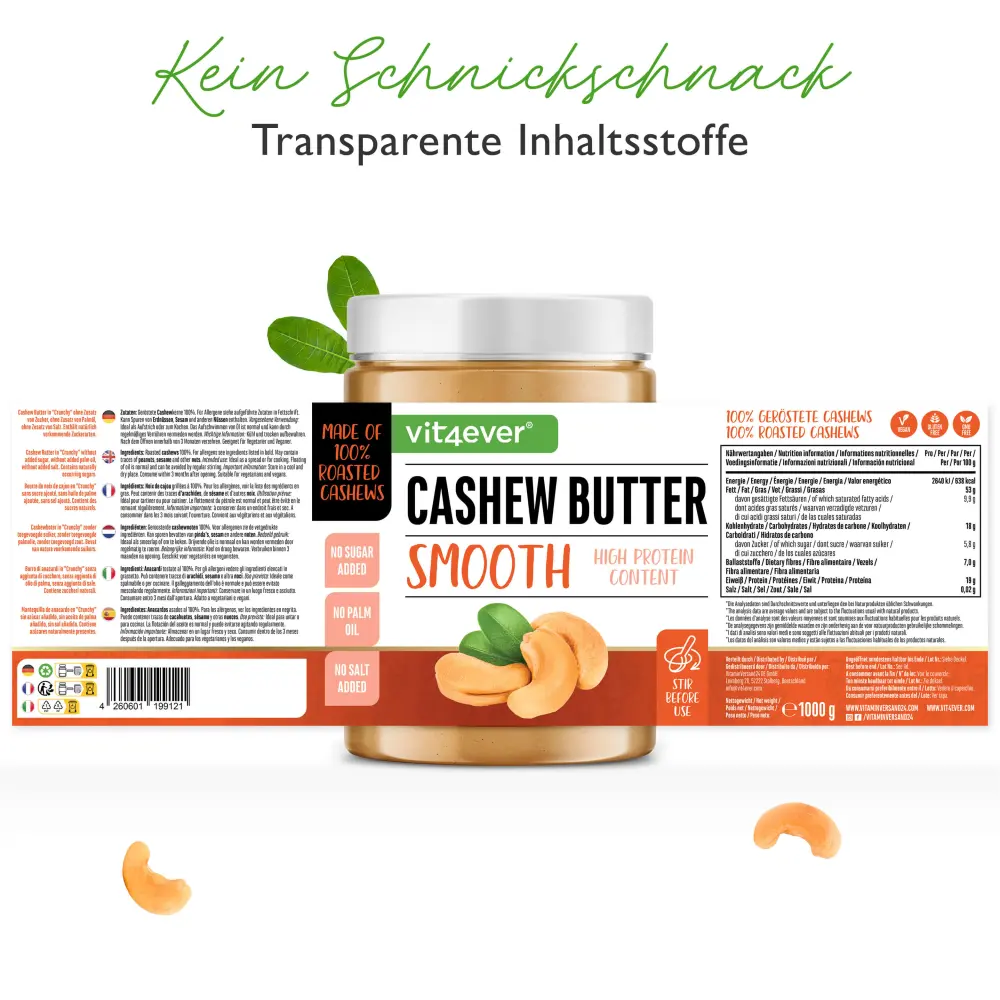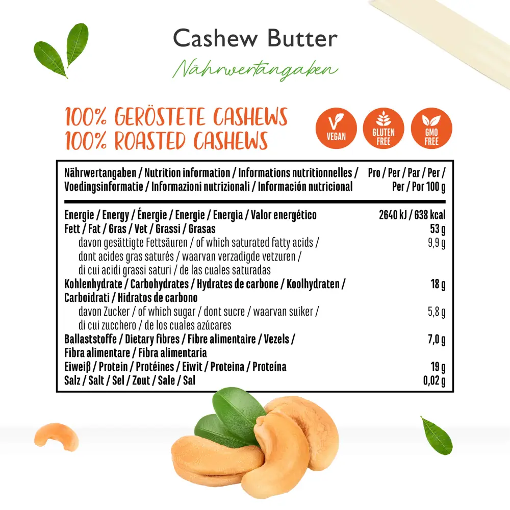 Cashew Butter Smooth consists of 100 per cent roasted cashews and has a natural flavour.