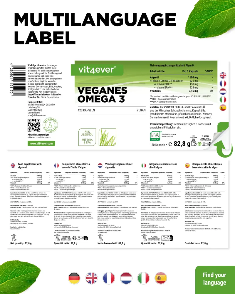 Algae oil omega 3 capsules from Schizochytrium sp. with 30% → DHA (docosahexaenoic acid) and 15% → EPA (eicosapentaenoic acid).