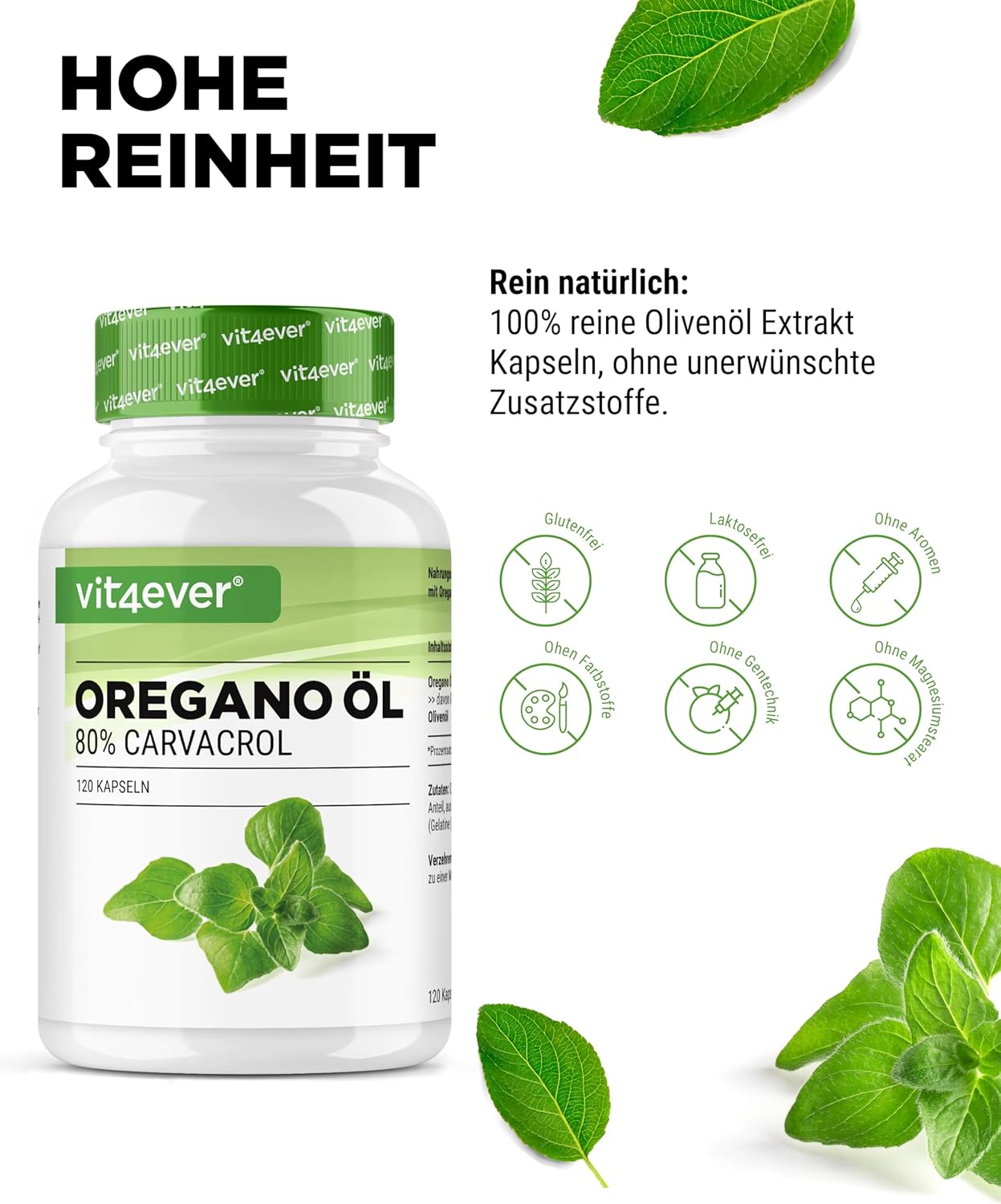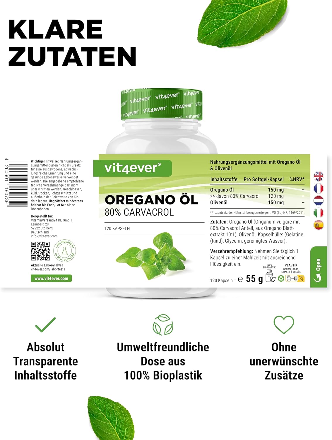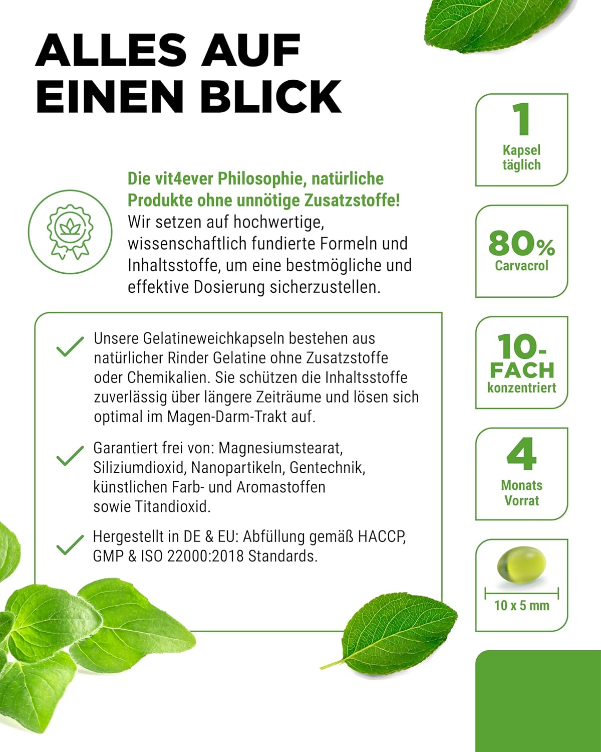 Oregano oil (Origanum vulgare, containing 80% carvacrol), olive oil, coating agent: gelatin softgel capsule (bovine gelatin), humectant: glycerine.