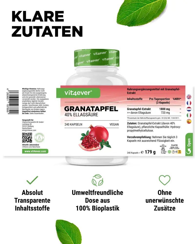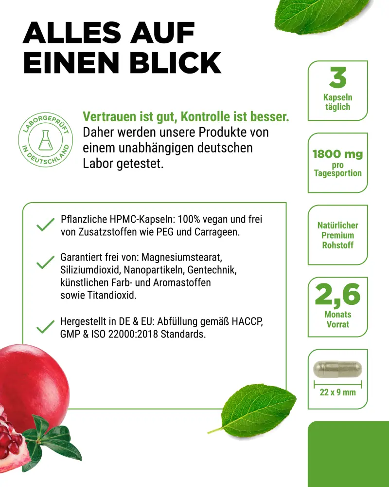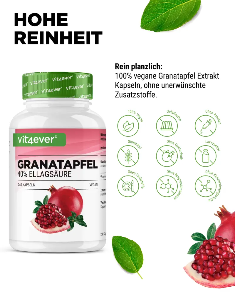 Pomegranate extract contains an extremely high proportion of the polyphenol ellagic acid, which is present in this product at a level of 40 per cent.