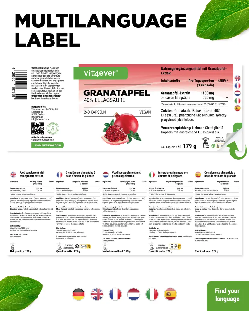 Pomegranate extract (of which 40% ellagic acid), vegetable capsule shell: hydroxypropyl methylcellulose.