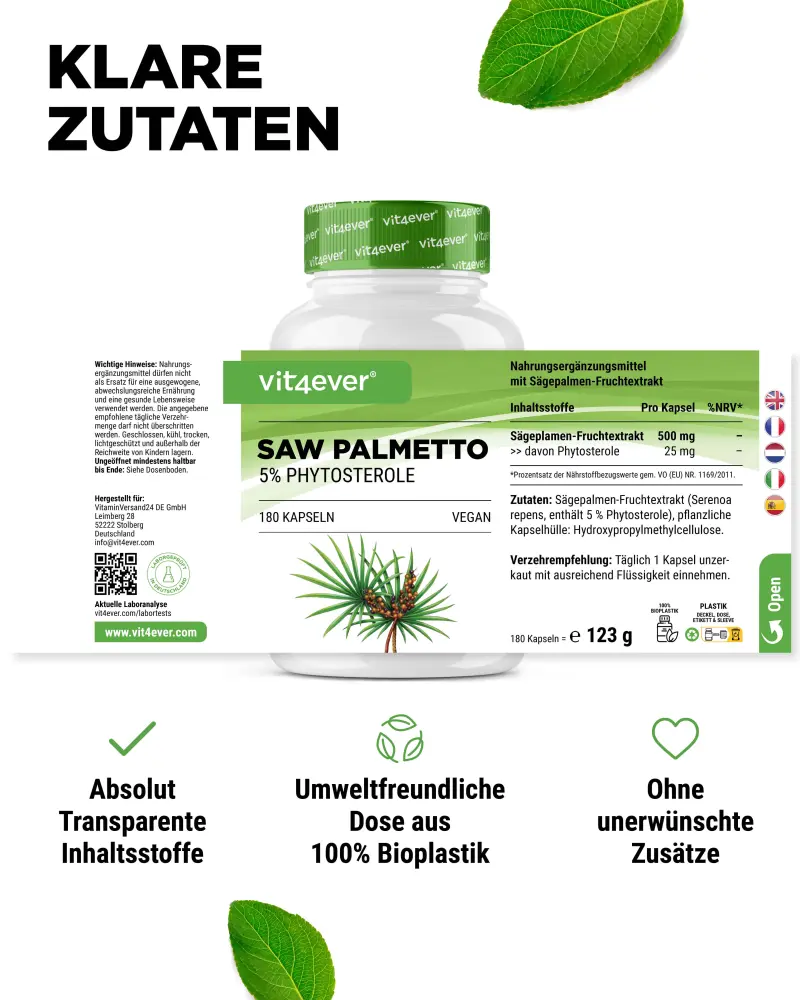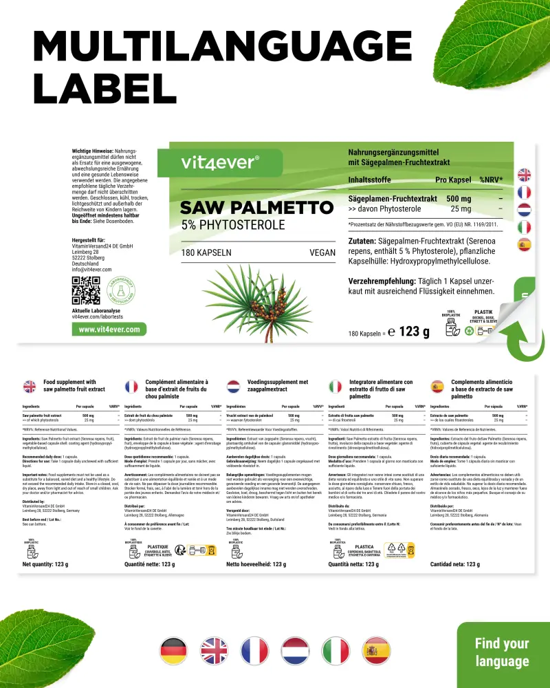 Saw palmetto fruit extract (Serenoa repens, contains 5% phytosterols), coating agent: hydroxypropyl methylcellulose (vegetable), anti-caking agent: rice extract.