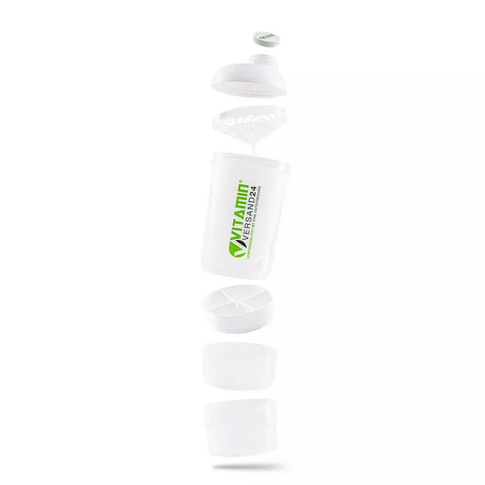 - Additional 150 ml and 200 ml storage compartment for protein powder and pills