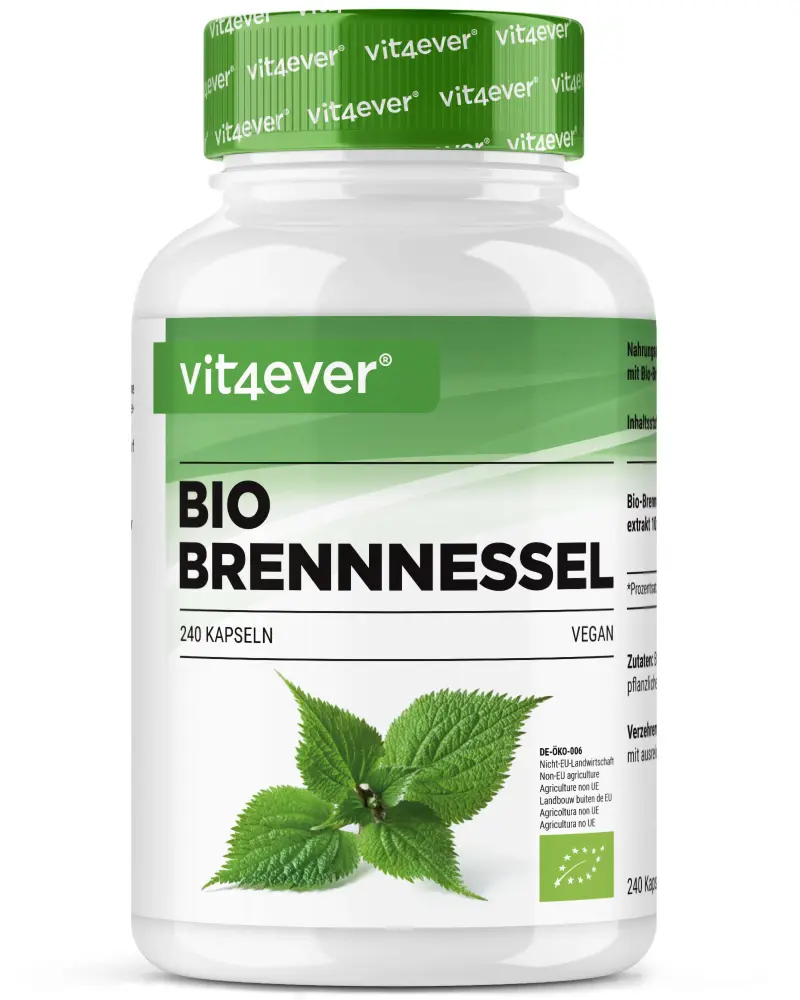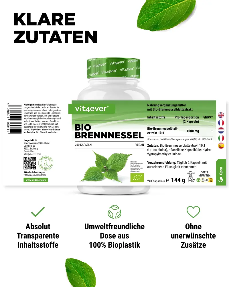 Organic nettle leaf extract 10:1 (Urtica dioica), coating agent: hydroxypropyl methylcellulose (plant-based).