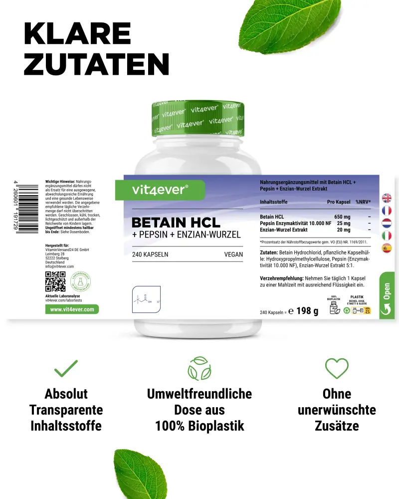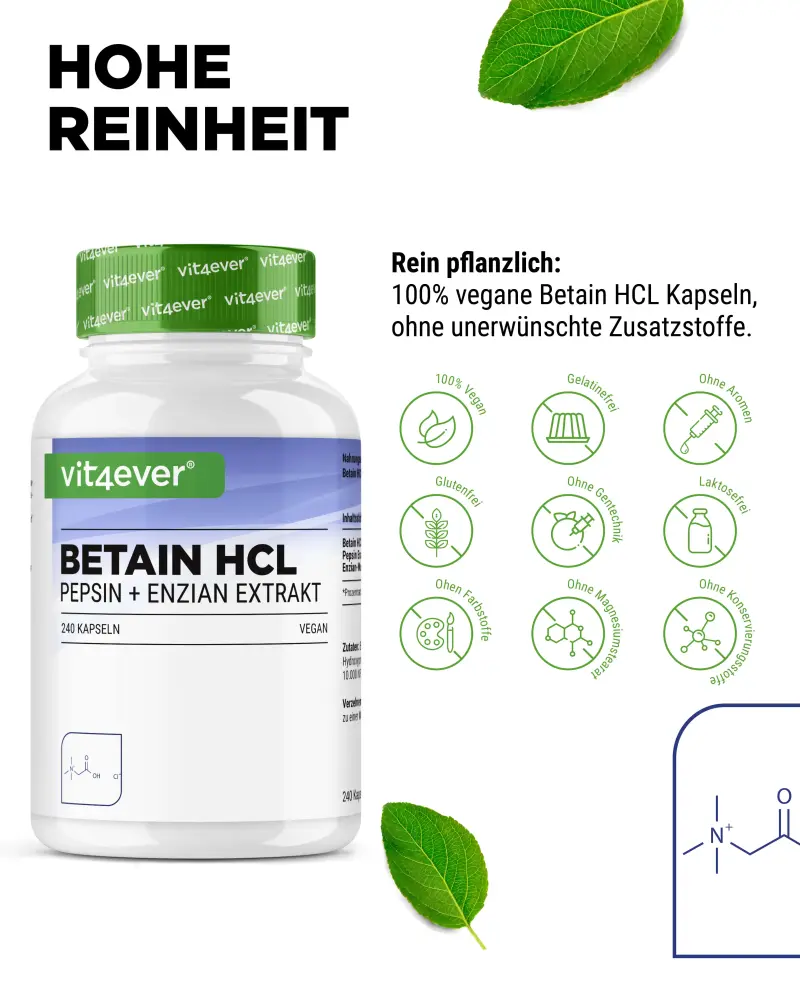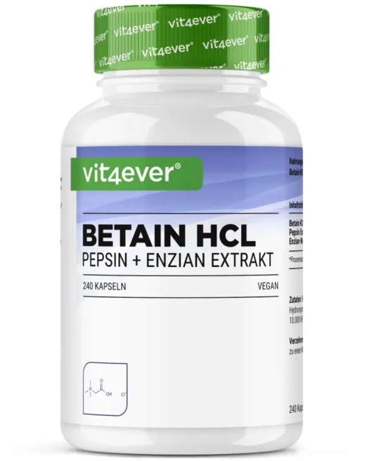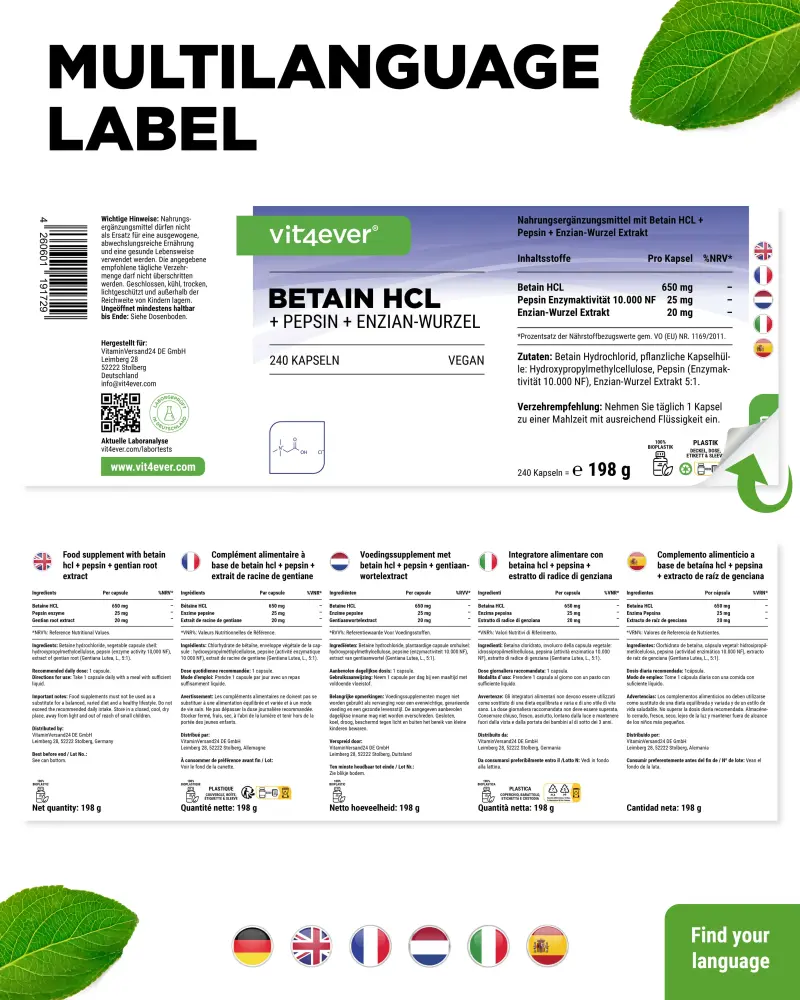 Betaine hydrochloride, coating agent: hydroxypropyl methylcellulose (vegetable), pepsin (enzyme activity 10,000 NF), gentian root extract 5:1.