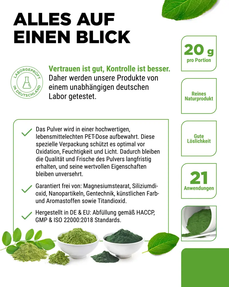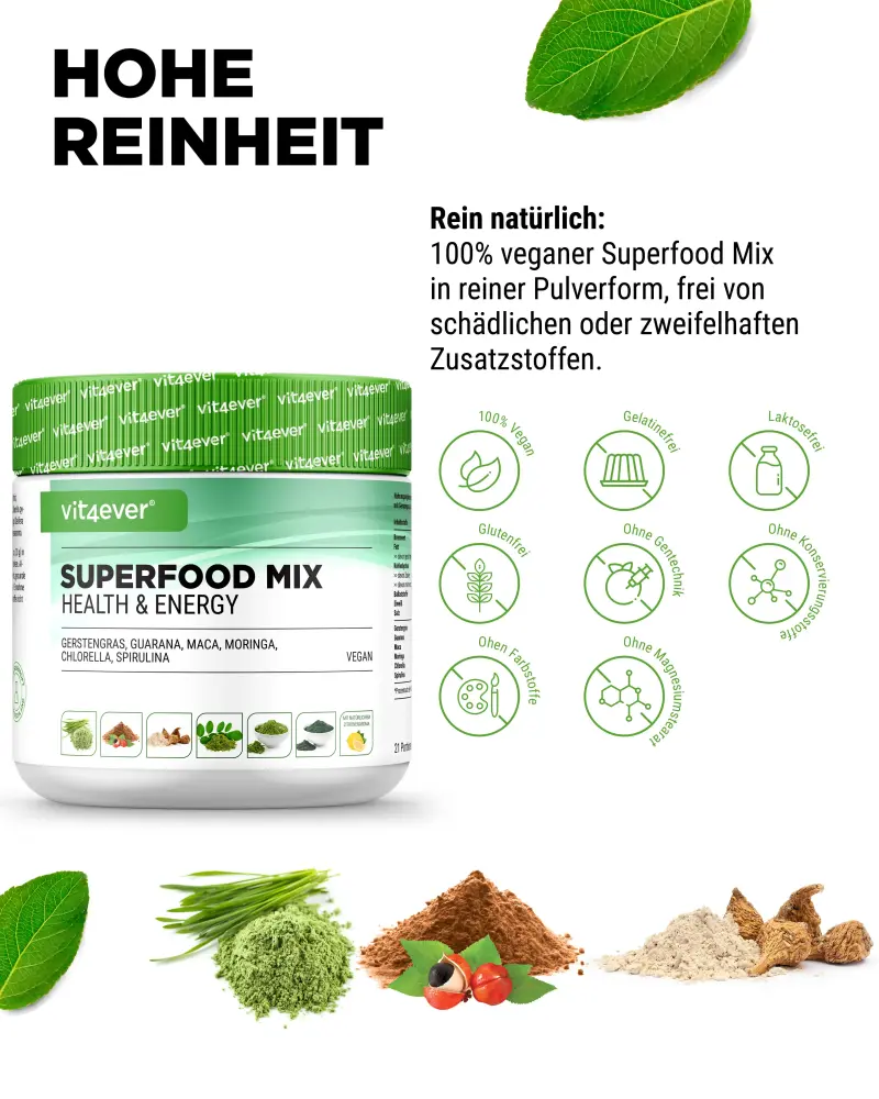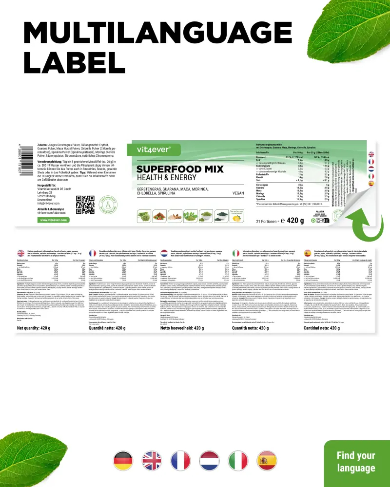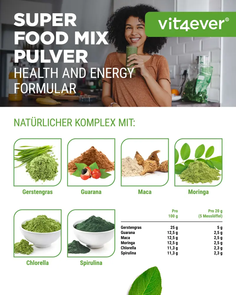 Mix of barley grass, guarana, maca, moringa, spirulina and chlorella with natural lemon flavor.