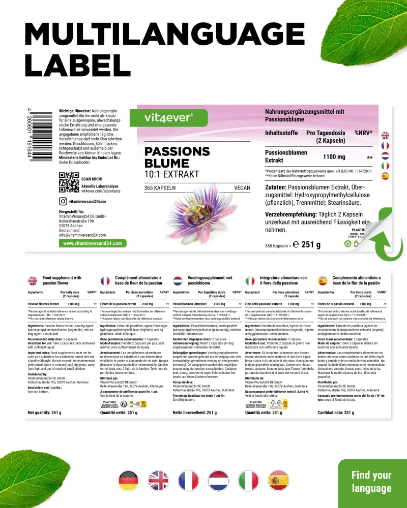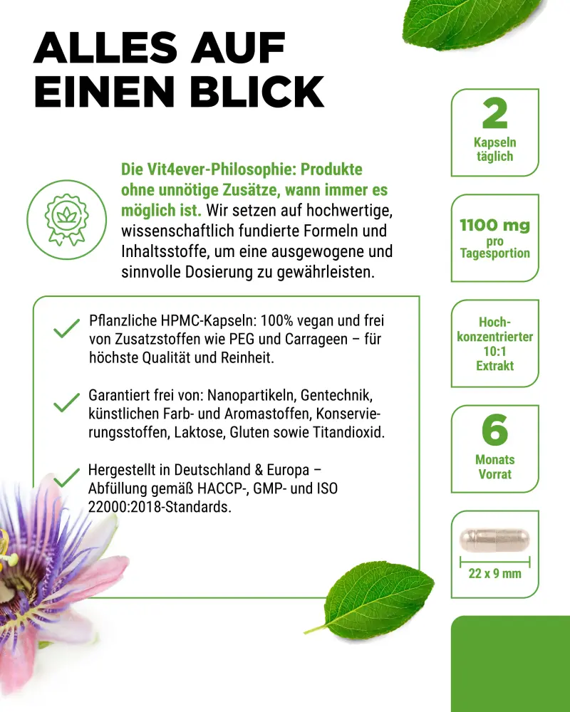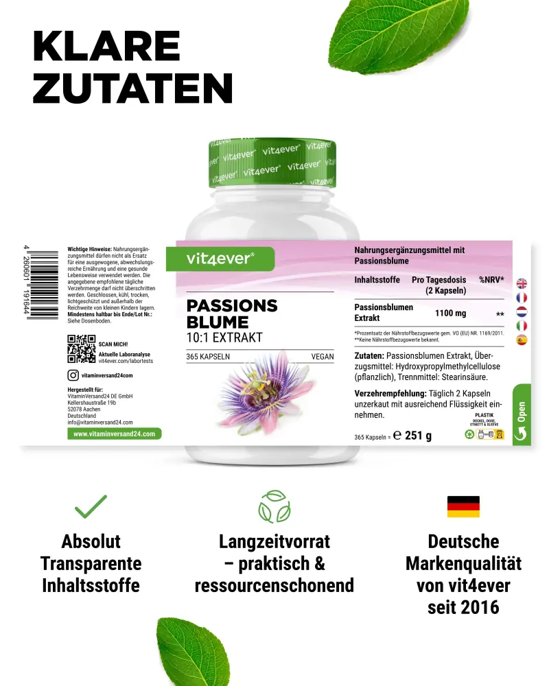 Passion flower extract 10:1, coating agent: hydroxypropyl methylcellulose (vegetable).