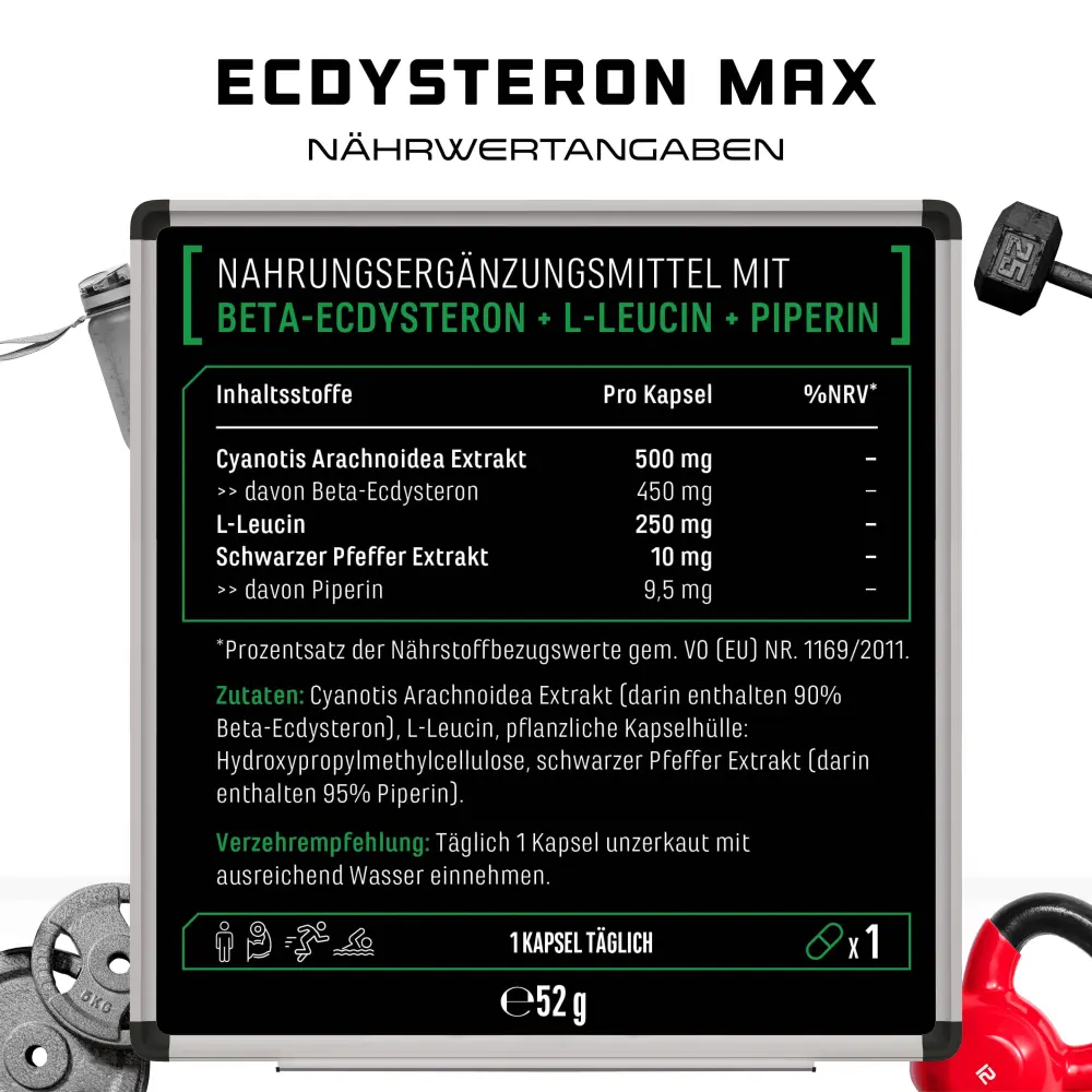 Cyanotis arachnoidea extract (contains 90% beta-ecdysterone), L-leucine, coating agent: hydroxypropylmethylcellulose (vegetable capsule shell), black pepper extract (contains 95% piperine).