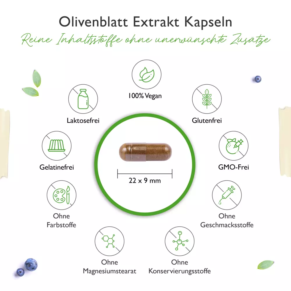 Olive leaf extract (Olea europaea, contains 40 % oleuropein), coating agent: hydroxypropyl methylcellulose (vegetable capsule shell), anti-caking agent: rice extract mixture.
