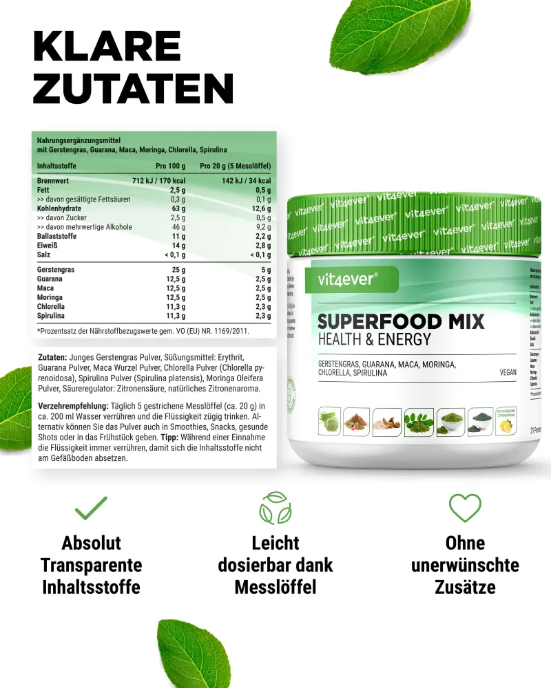 Mix of barley grass, guarana, maca, moringa, spirulina and chlorella with natural lemon flavor.