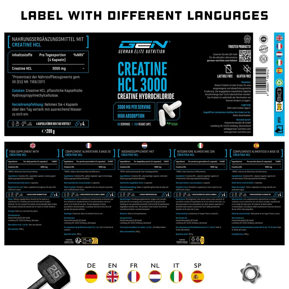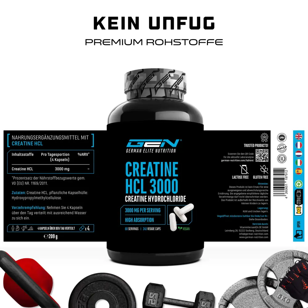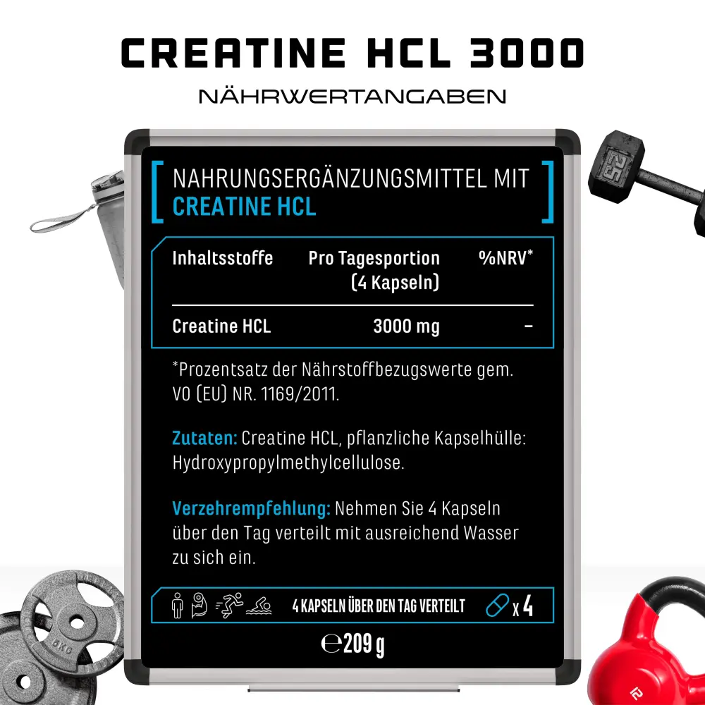 La creatina HCL es un producto de primera calidad que te aporta 3000 mg de clorhidrato de creatina (HCL) puro por dosis diaria recomendada.
