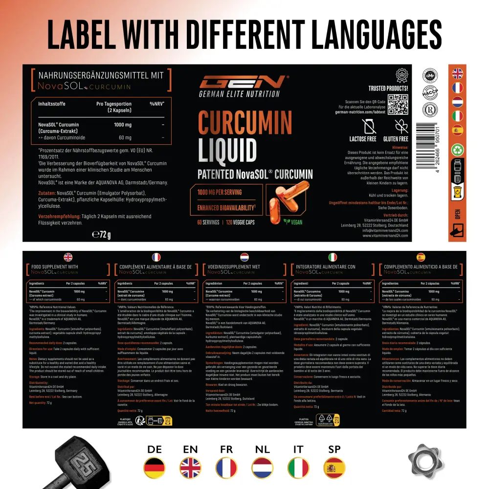 NovaSOL® Curcumina (emulsionante: polisorbato), extracto de cúrcuma, agente de recubrimiento: hidroxipropilmetilcelulosa (de origen vegetal).