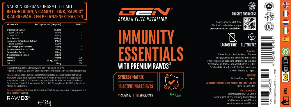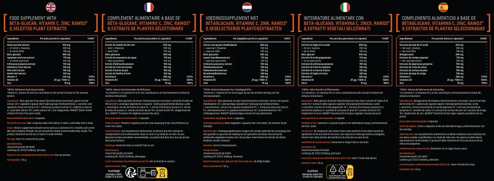 Beta-glucanos de levadura (Saccharomyces cerevisiae), extracto de hoja de té verde 20:1, cubierta vegetal de la cápsula: hidroxipropilmetilcelulosa, ácido L-ascórbico, extracto de Ilex japonica 15:1, extracto de Echinacea purpurea 5:1, extracto de bayas de saúco 4:1, extracto de corteza de pino 10:1, extracto de ortiga 10:1, bisglicinato de zinc, RAWD3® (vitamina D3 vegetal procedente del pino).