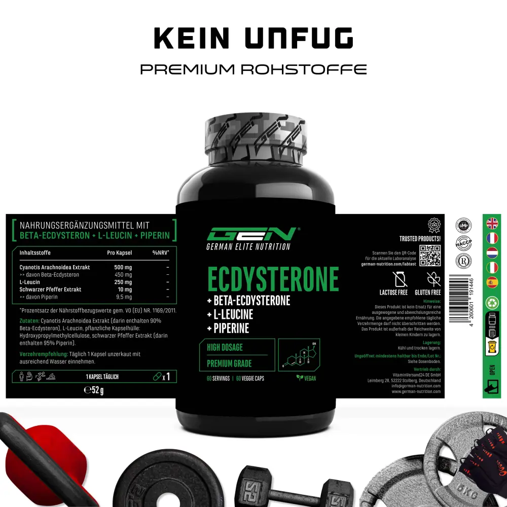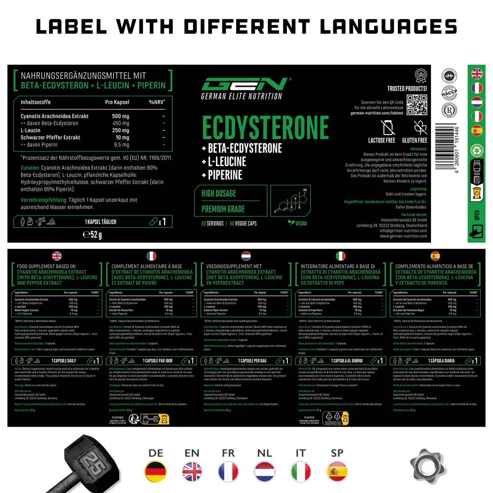 Extracto de Cyanotis arachnoidea (contiene 90% de beta-ecdysterona), L-leucina, agente de recubrimiento: hidroxipropilmetilcelulosa (cubierta de cápsula vegetal), extracto de pimienta negra (contiene 95% de piperina).
