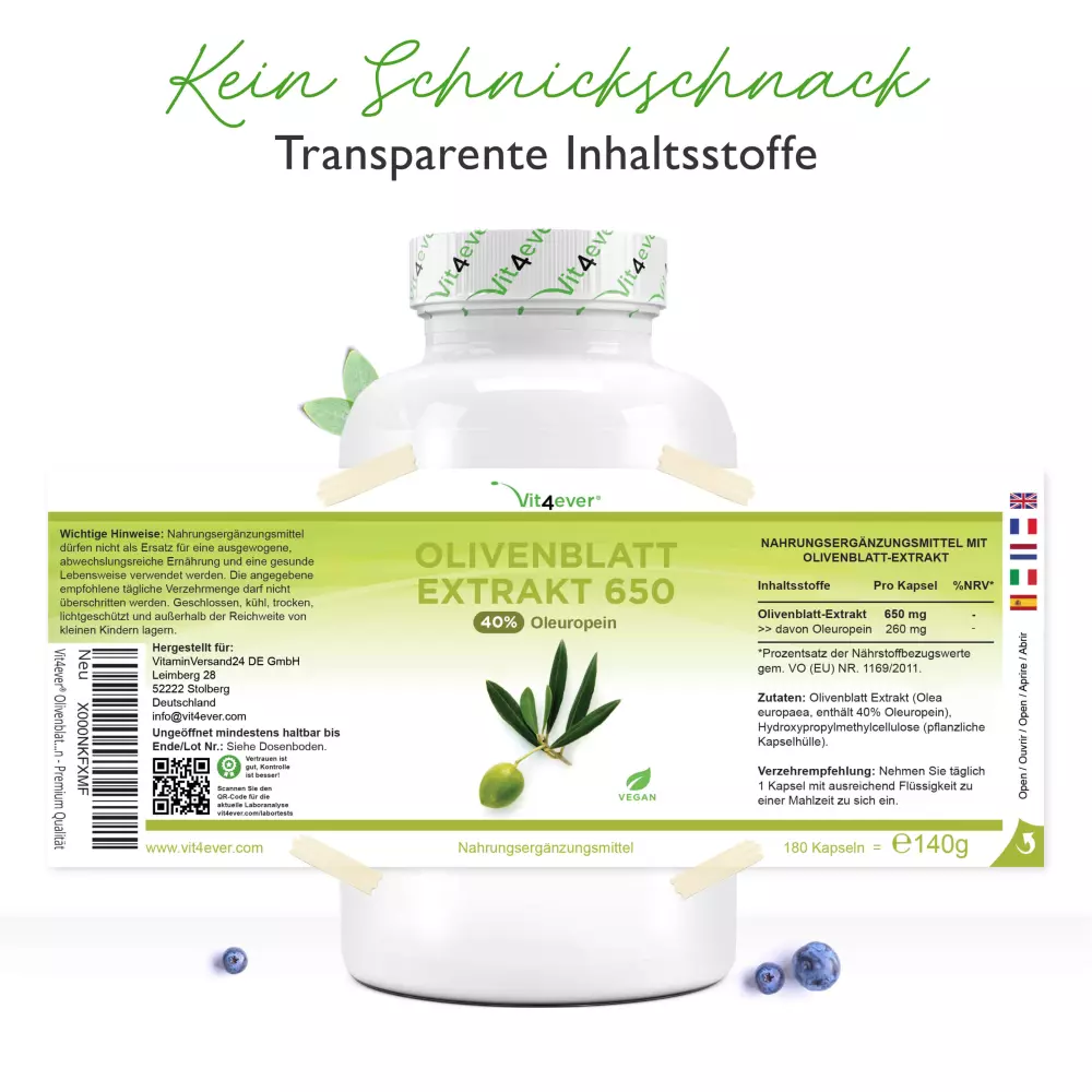 Extracto de hoja de olivo (Olea europaea, contiene un 40 % de oleuropeína), agente de recubrimiento: hidroxipropilmetilcelulosa (cubierta de cápsula vegetal), antiaglomerante: mezcla de extractos de arroz.