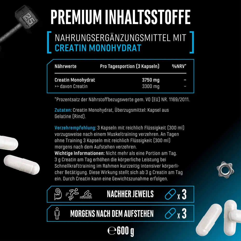 Créatine monohydrate, agent d’enrobage : capsule de gélatine (bœuf).