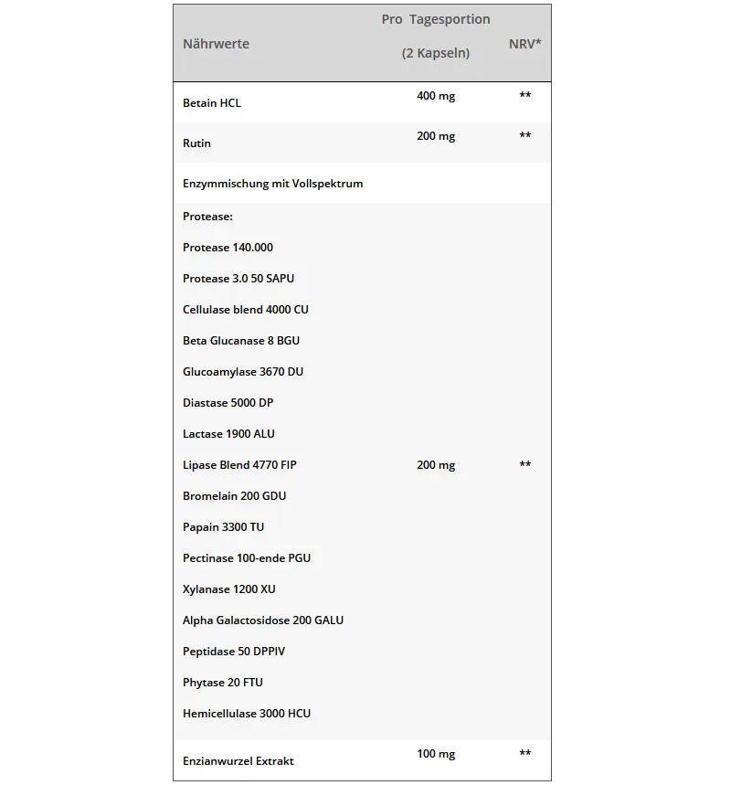 Chlorhydrate de bétaïne, extrait de bourgeons de Sophora japonica 6:1 (contenant 95 % de rutine), agent d’enrobage (JC CAPS) : (hydroxypropylméthylcellulose (d’origine végétale), gellane), mélange d’enzymes à spectre complet (protéase, mélange de cellulases, bêta-glucanase, glucoamylase, diastase, lactase, mélange de lipases, bromélaïne, papaïne, pectinase, xylanase, alpha-galactosidase, dipeptidylpeptidase, phytase, hémicellulase), extrait de racine de gentiane 5:1.