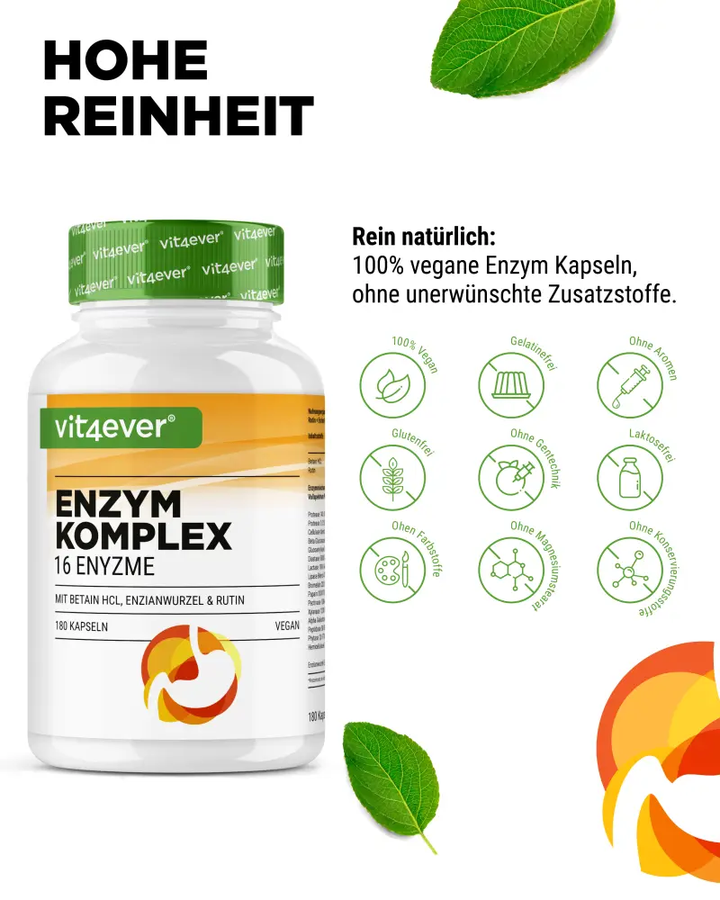 Le complexe enzymatique est une composition de rutine, d’extrait de racine de gentiane, de bétaïne et de 15 enzymes différentes qui ont des effets différents mais coordonnés sur notre digestion et la santé de nos intestins.