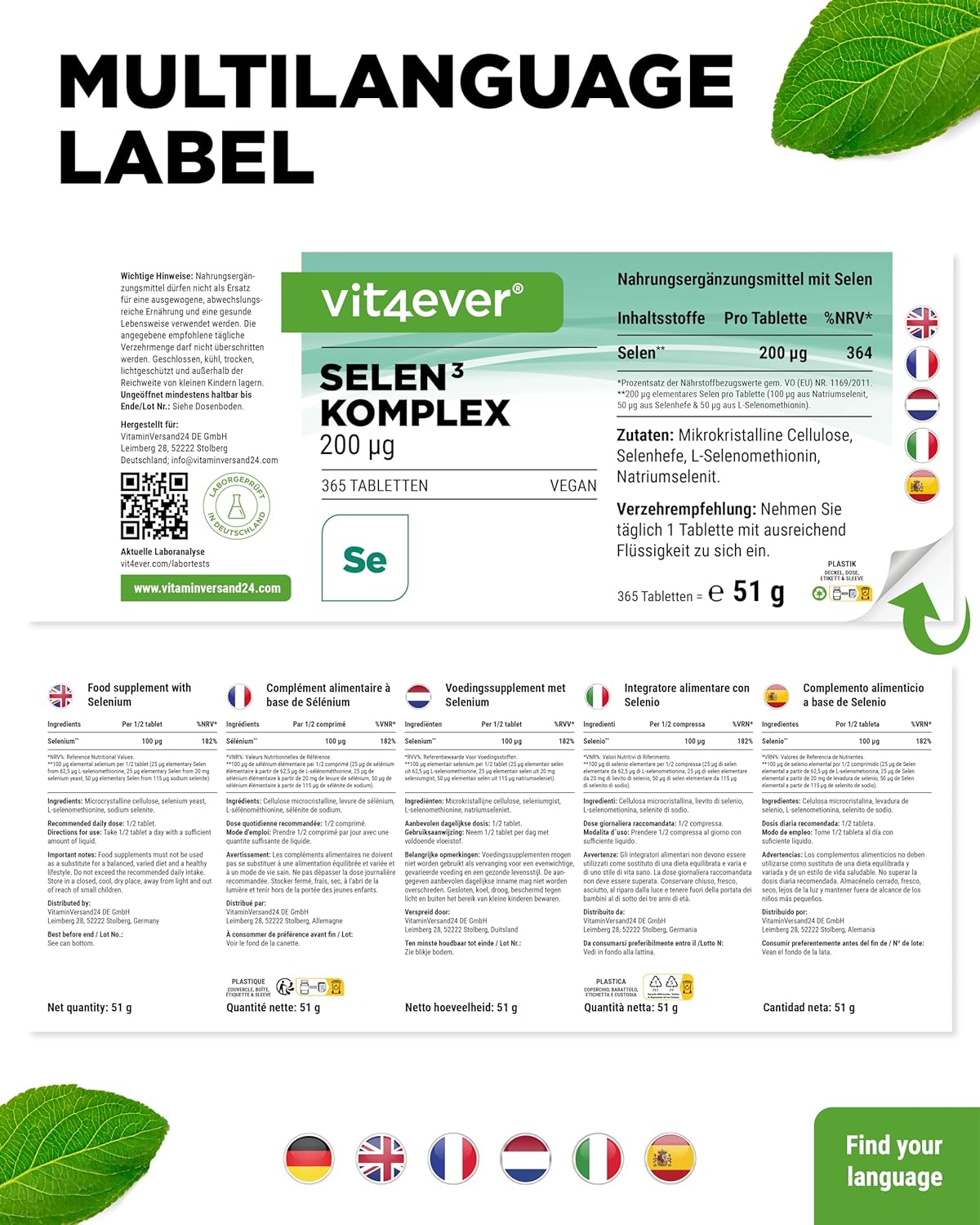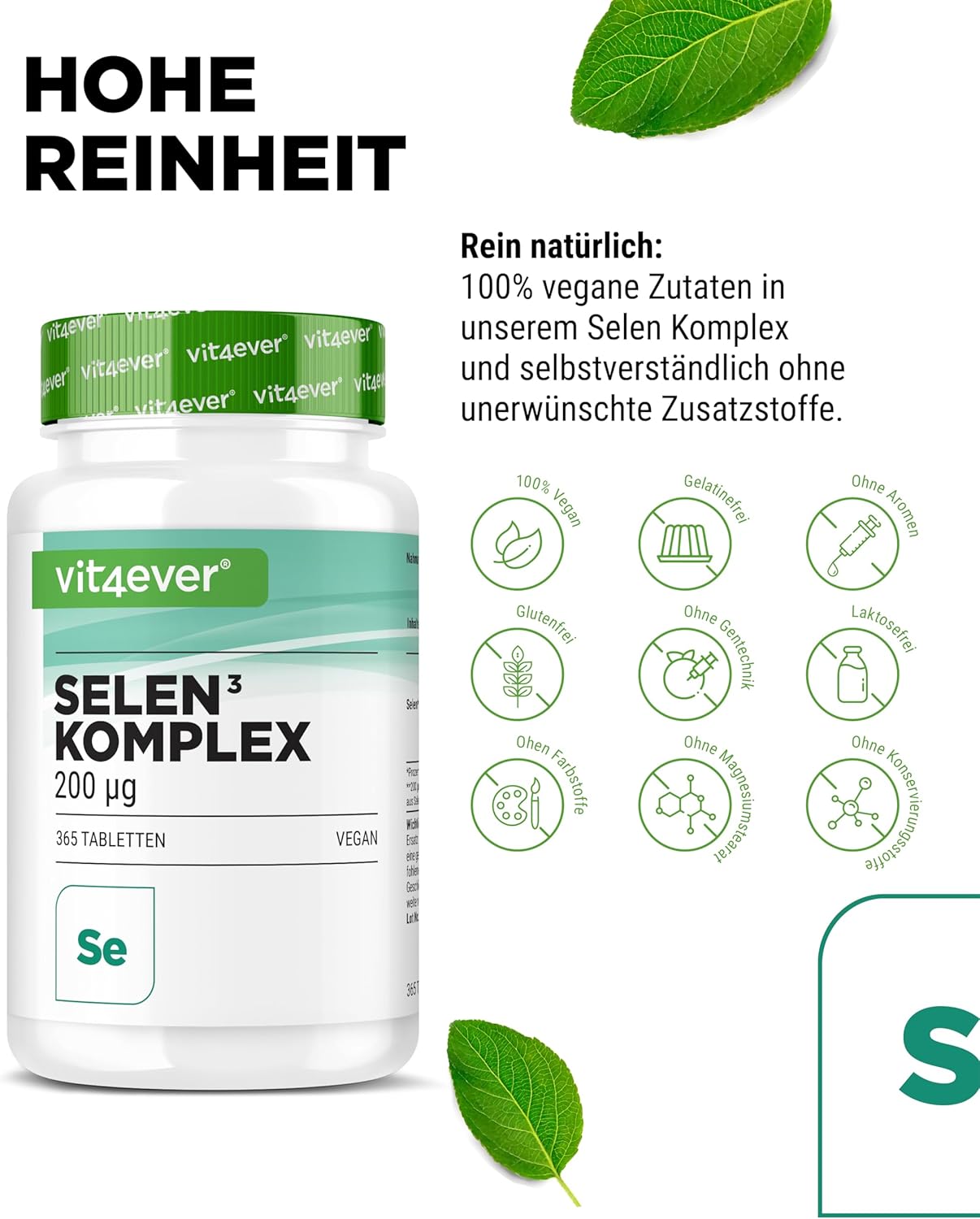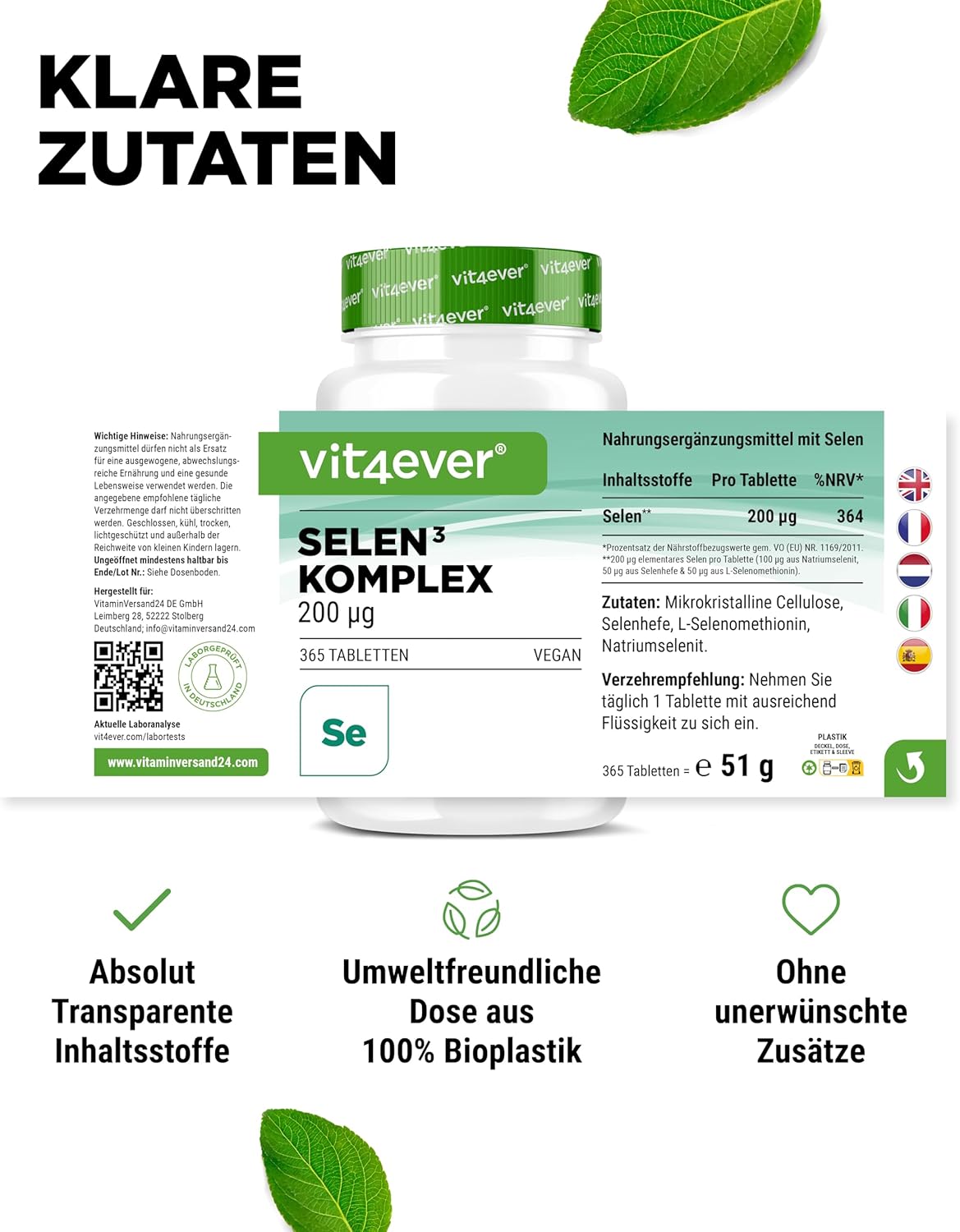 Die hochdosierten Selentabletten enthalten einen 3-fach Komplex aus 50% Natriumselenit, 25% Selenhefe und 25% Selenmethionin, was für eine optimale Bioverfügbarkeit und Verwertbarkeit sorgt.
