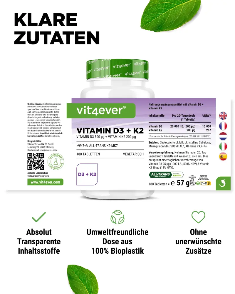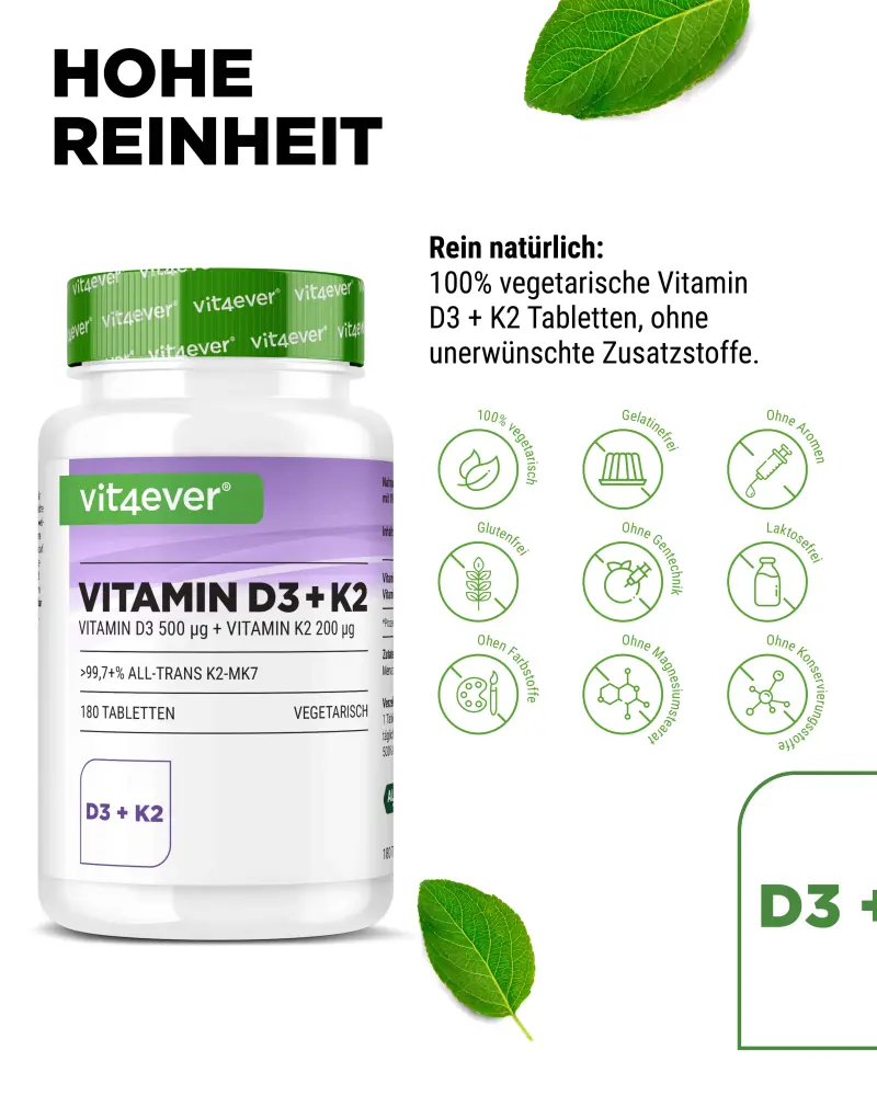 → Vitamine D3 hautement dosée à 20.000 UI, combinée à la → vitamine K2 à base de la matière première de qualité supérieure K2VITAL.