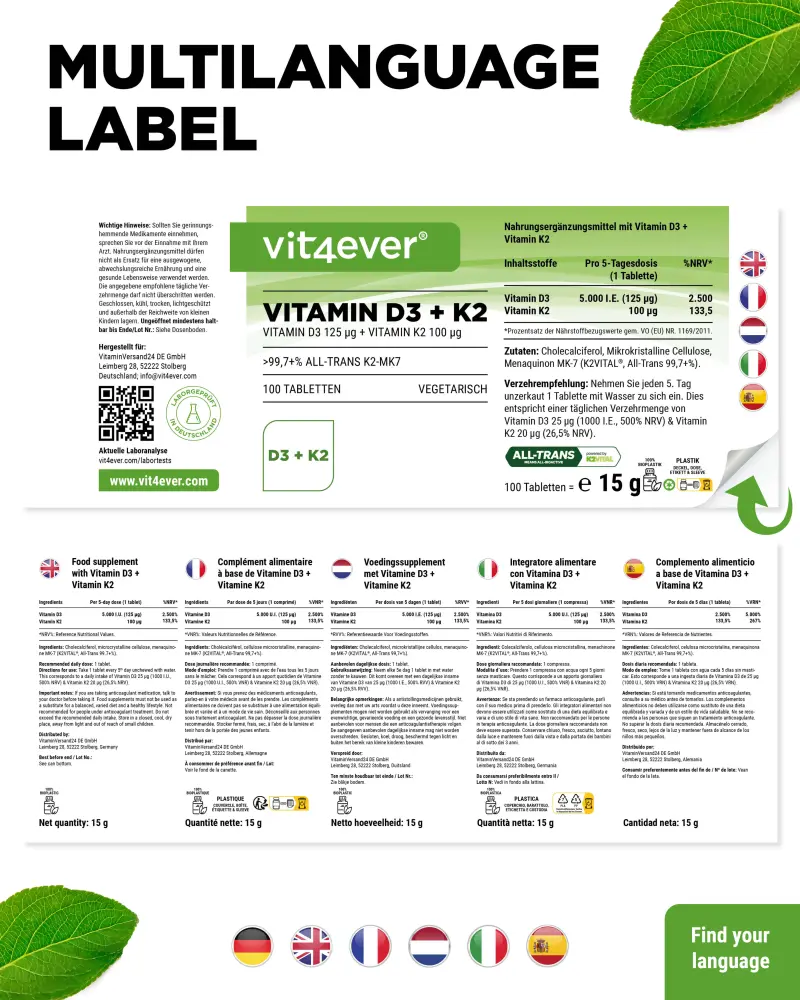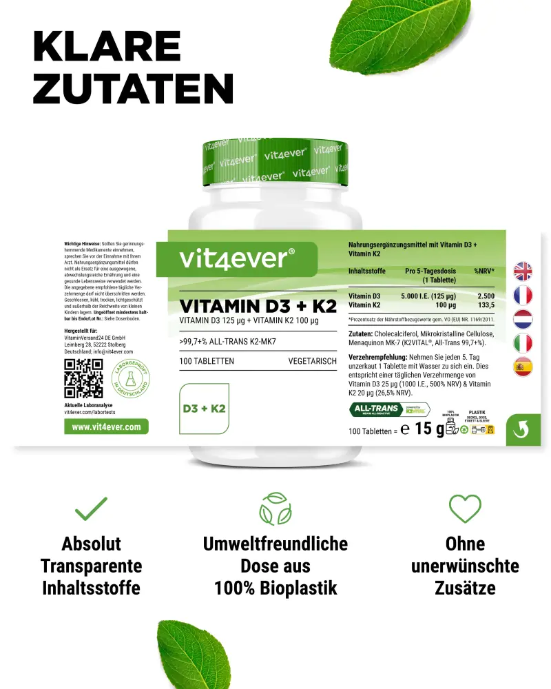 Complétée de manière optimale par → la vitamine K2, qui est un partenaire optimal de la vitamine D, la vitamine D3 5000 UI + K2 est idéale pour maintenir un taux sain de vitamine D dans l’organisme.
