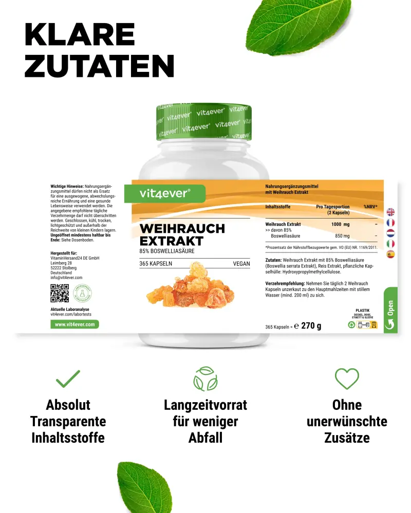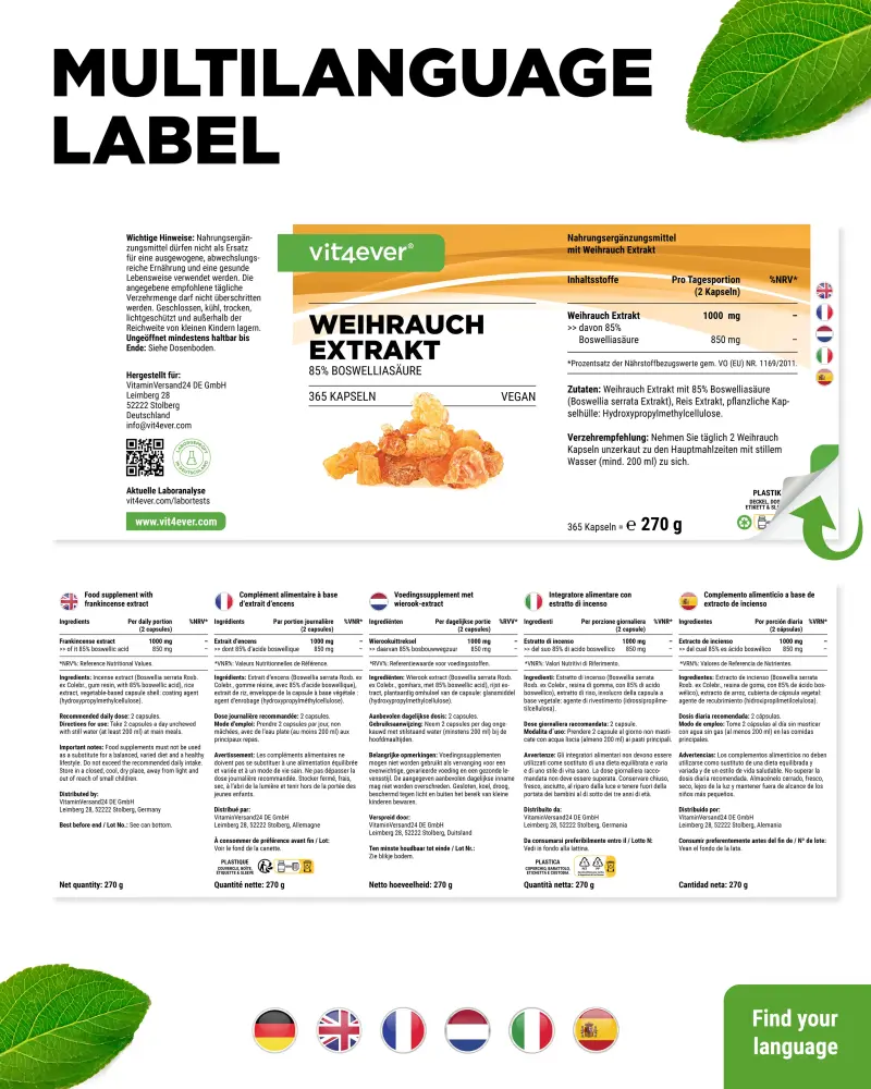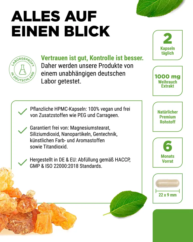 Estratto di incenso con l’85% di acido boswellico (estratto di Boswellia serrata), agente di rivestimento: idrossipropilmetilcellulosa (di origine vegetale)