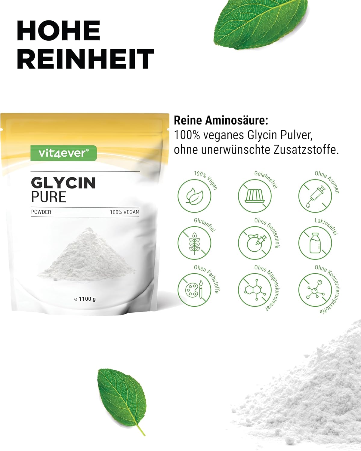La glicina è un aminoacido non essenziale e proteinogenico, necessario all’organismo per la formazione, tra l’altro, di glutatione, colina, porfirine, purine, creatina, collagene ed emoglobina.