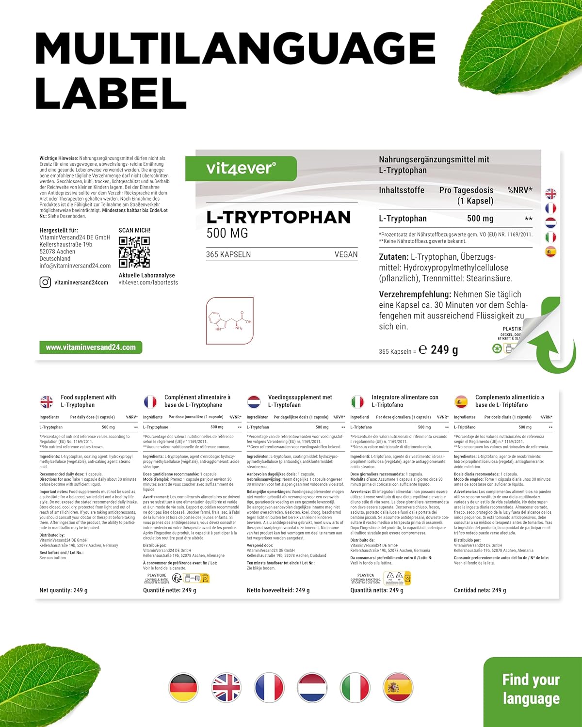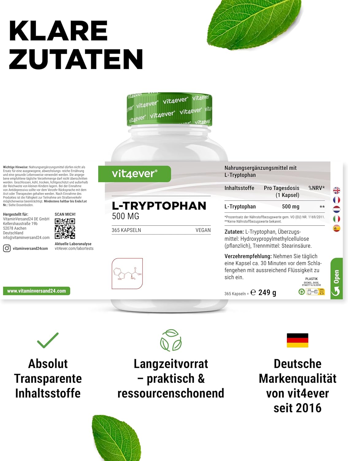 L-triptofano, agente di rivestimento idrossipropilmetilcellulosa (vegetale).