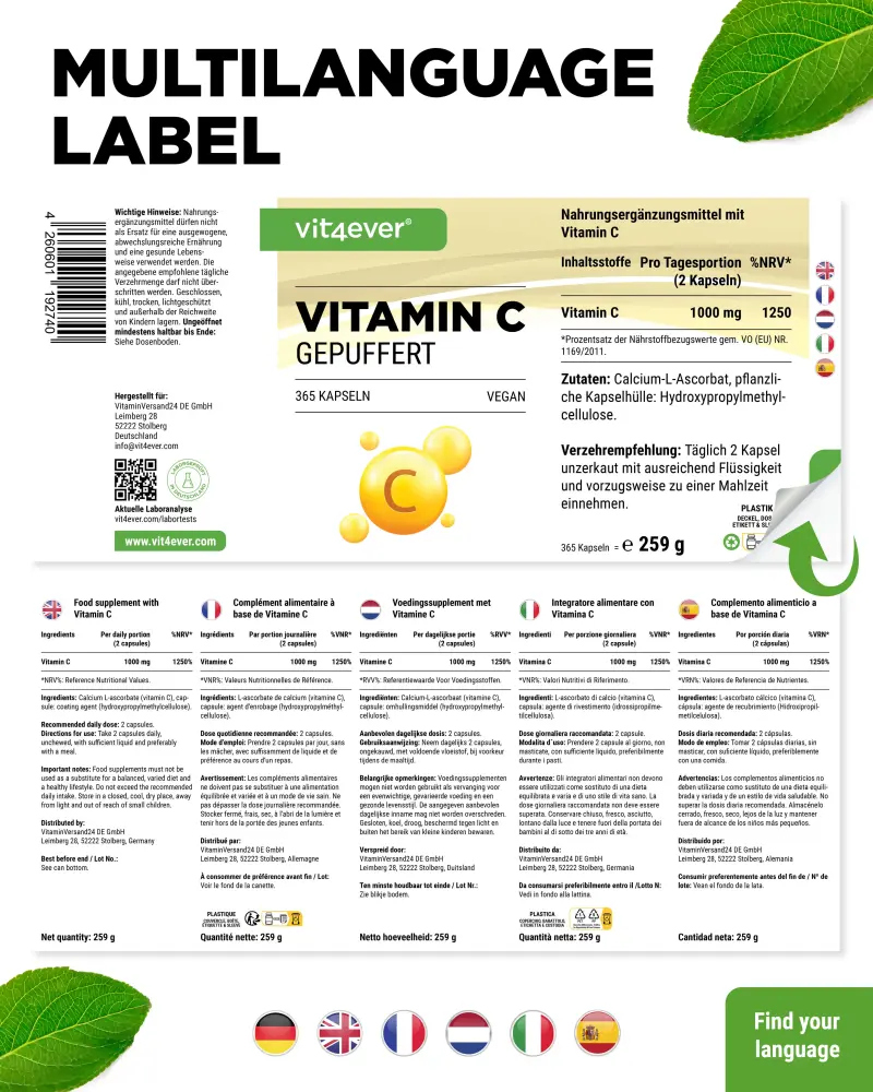 “Tamponata” → la vitamina C, qui sotto forma di ascorbato di calcio (L-ascorbato di calcio), viene rilasciata uniformemente nell’organismo in piccole quantità nell’arco di diverse ore (effetto di rilascio temporale) e allo stesso tempo ha una biodisponibilità molto elevata.