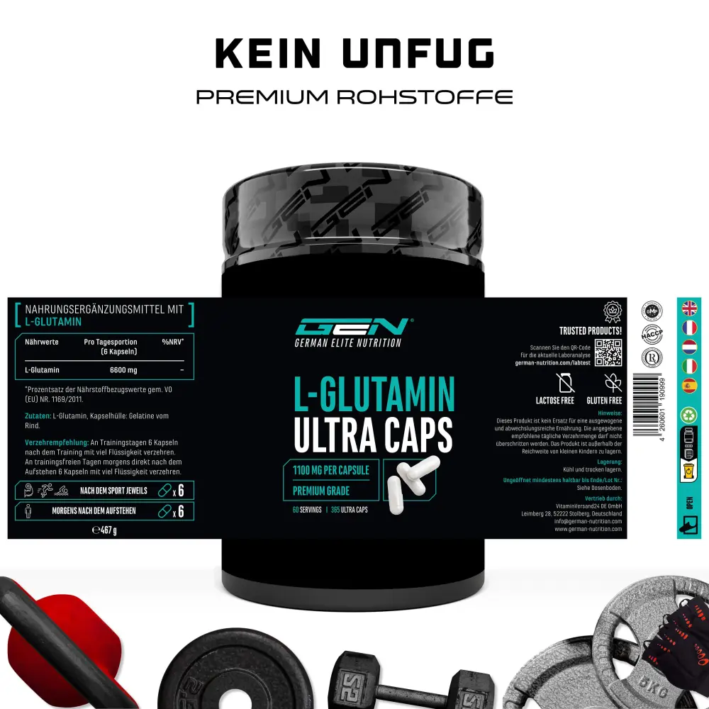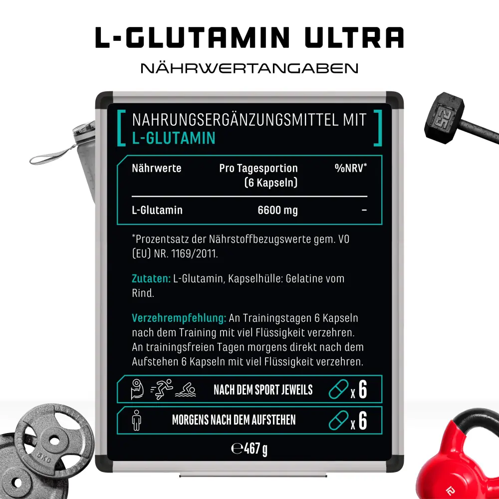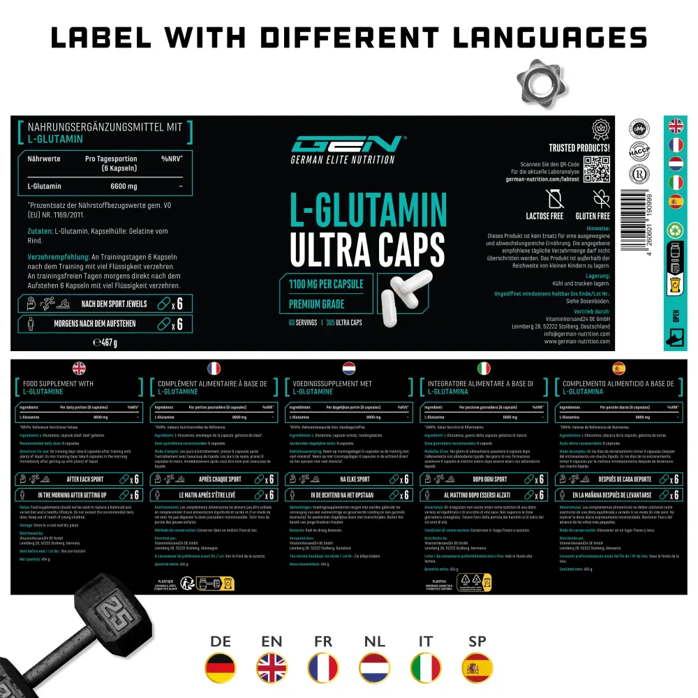 L-glutamine, omhulsel: capsule gemaakt van gelatine (rund).