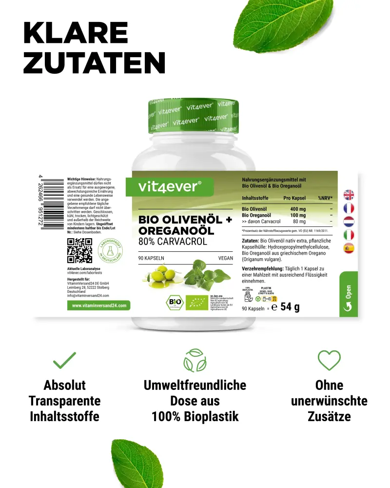 Biologische extra vierge olijfolie, coatingmiddel: hydroxypropylmethylcellulose (plantaardig), biologische oregano-olie uit Griekse oregano (Origanum vulgare).