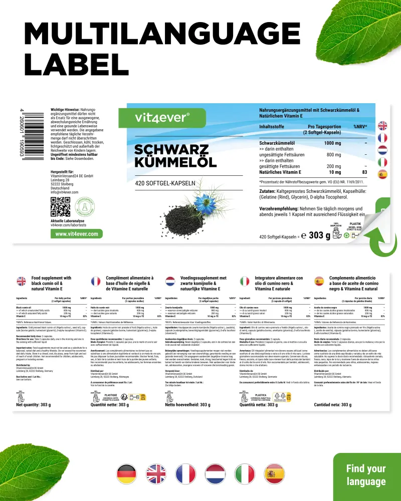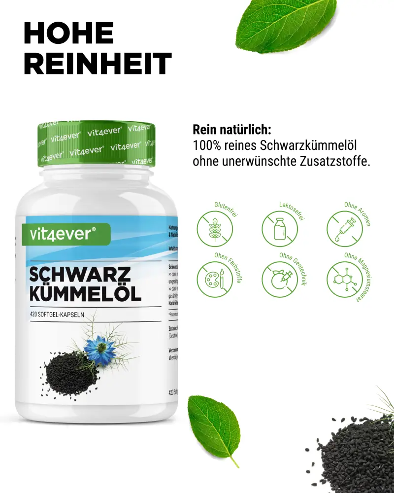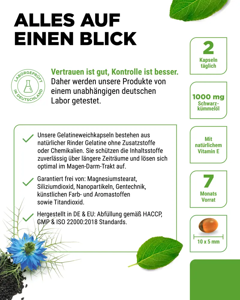 Elke capsule bevat ook 5 mg natuurlijke → vitamine E, die niet alleen de zwarte komijnolie beschermt, maar ook een krachtige antioxidant is in het lichaam.