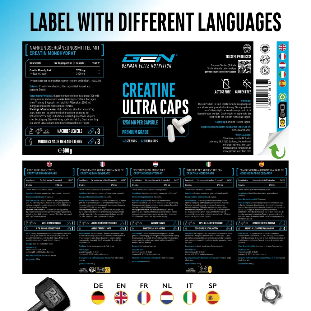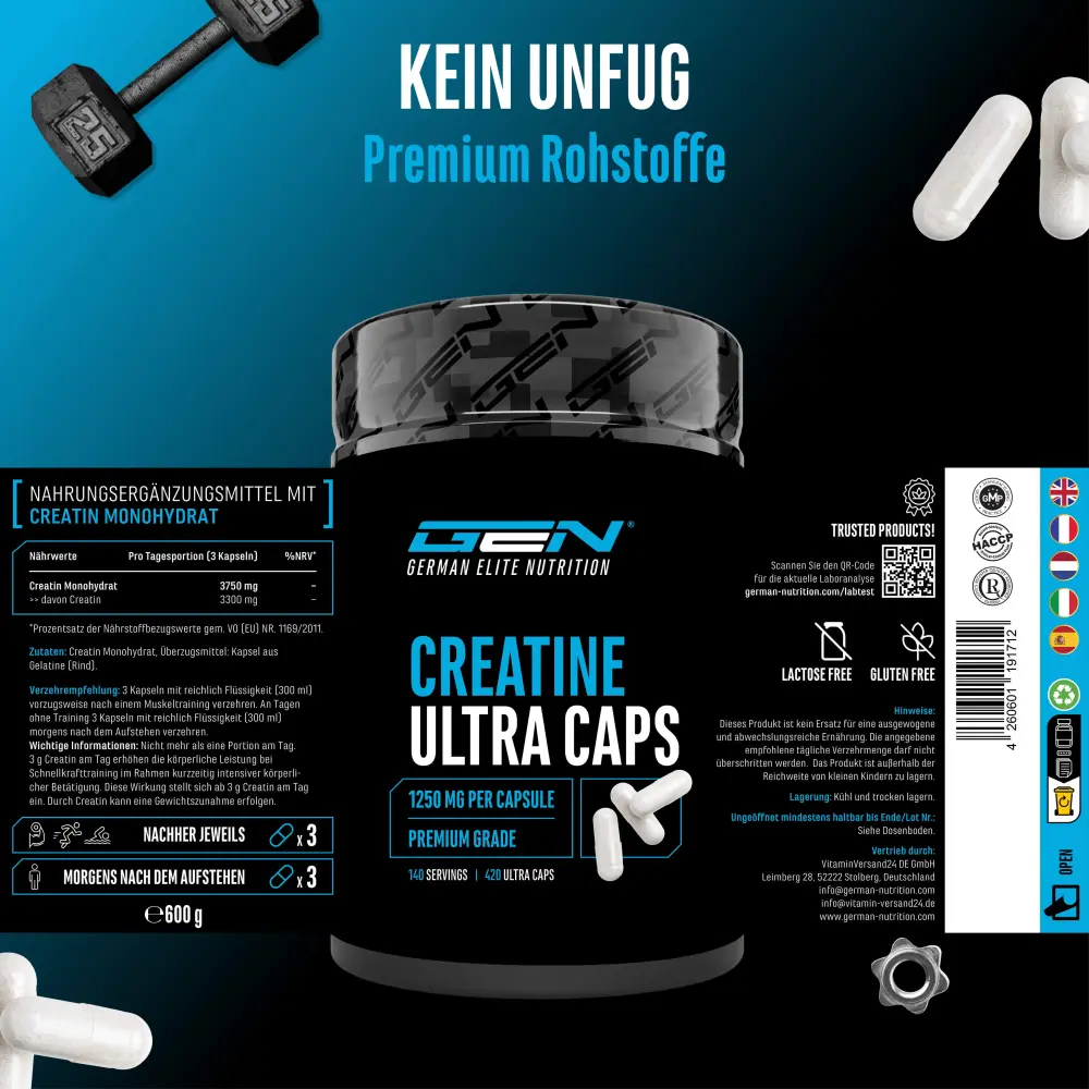 Kapsułki Creatine Ultra Caps zawierają bardzo wysoką dawkę 1250 mg aktywnego składnika na kapsułkę.