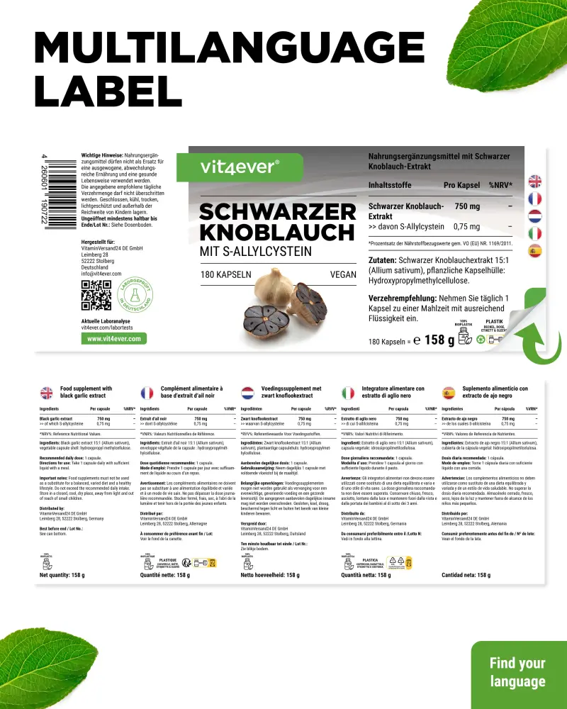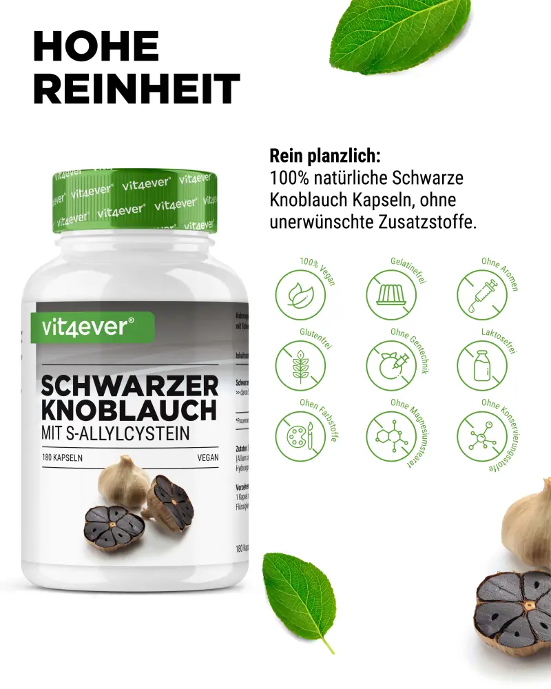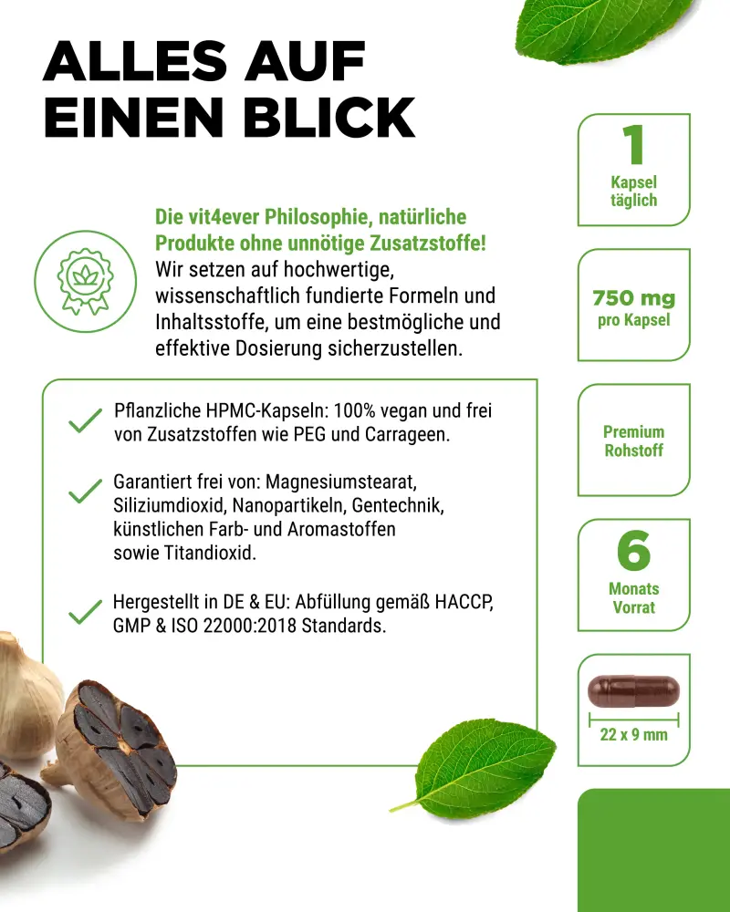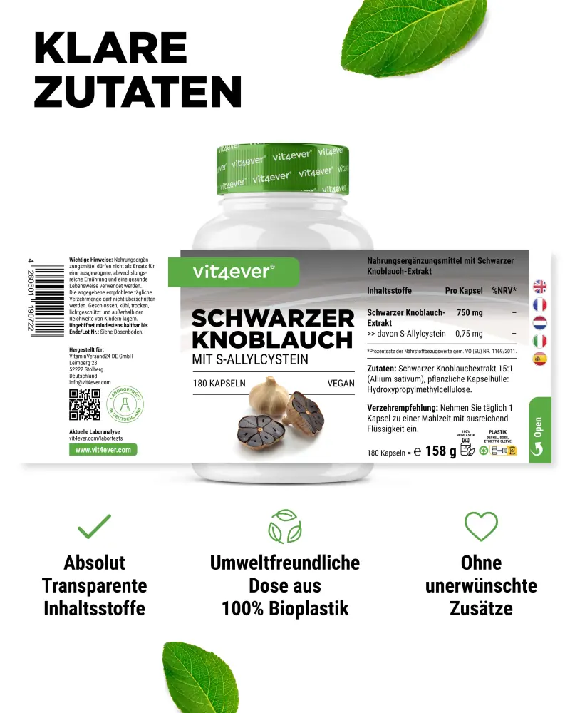 Wyciąg z czarnego czosnku 15:1 (Allium sativum). Substancja powlekająca: hydroksypropylometyloceluloza (pochodzenia roślinnego), środek przeciwzbrylający: ekstrakt z ryżu.