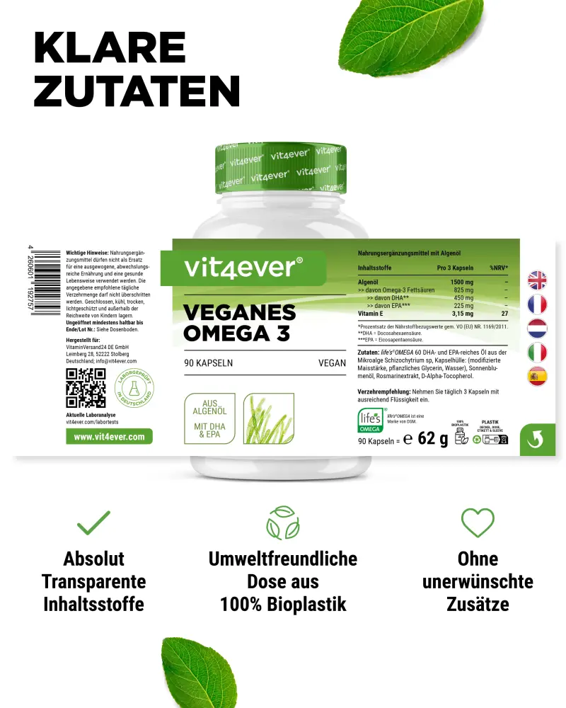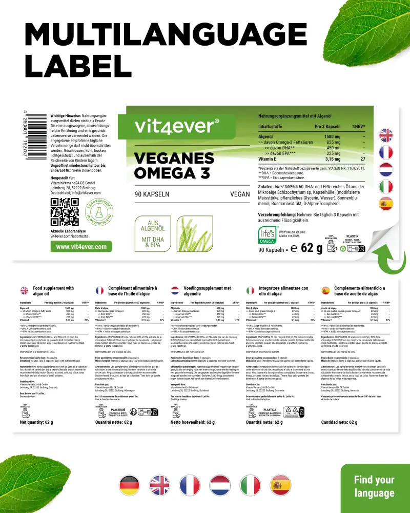 Kapsułki omega 3 z olejem z alg Schizochytrium sp. zawierające 30% → DHA (kwas dokozaheksaenowy) i 15% → EPA (kwas eikozapentaenowy).