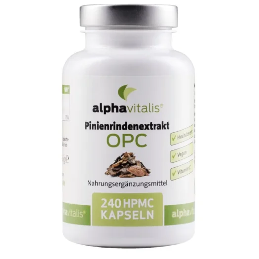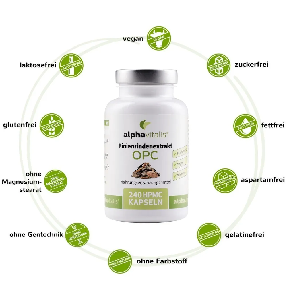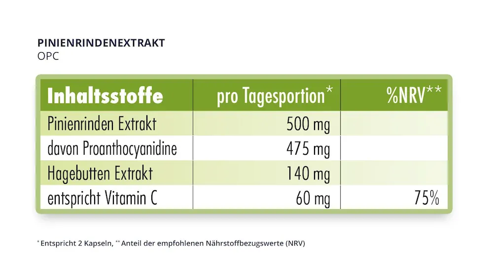 Jede Kapsel enthält 250 mg Pinienrindenextrakt mit hochdosierten 95 Prozent Proanthocyanidine und mehr als 80 mg echtem OPC sowie Vitamin C aus Hagebuttenextrakt.