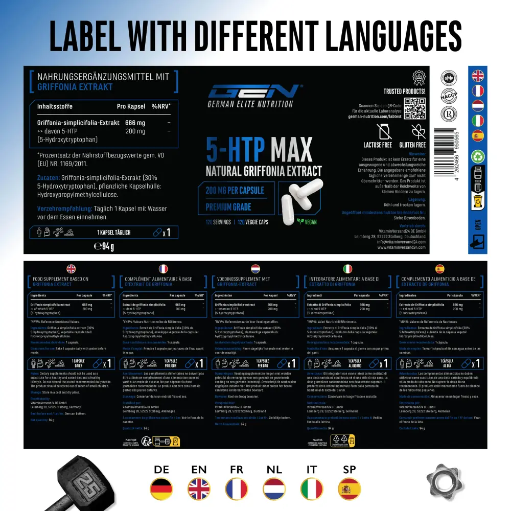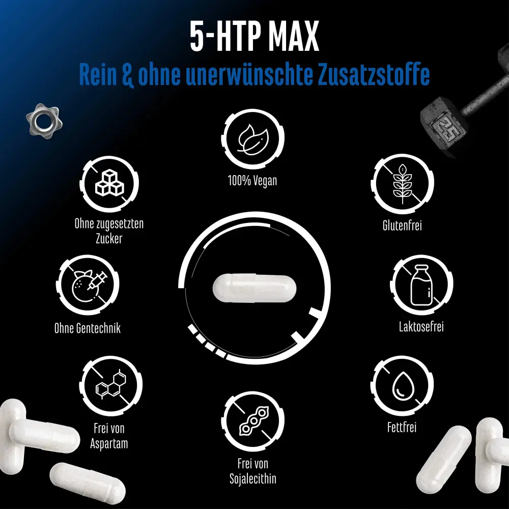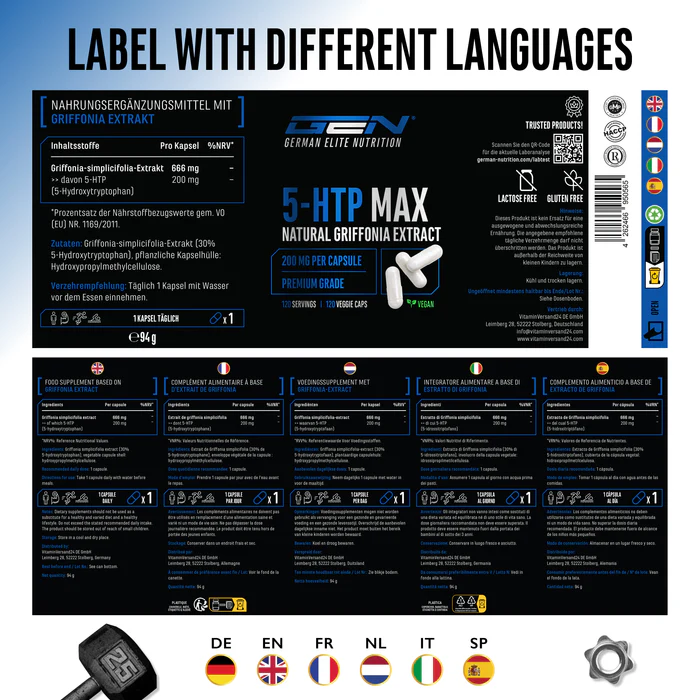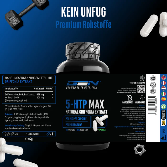 Griffonia-simplicifolia-Extrakt (5-Hydroxytryptophan), Überzugsmittel: Hydroxypropylmethylcellulose (pflanzlich).