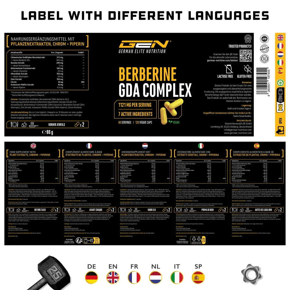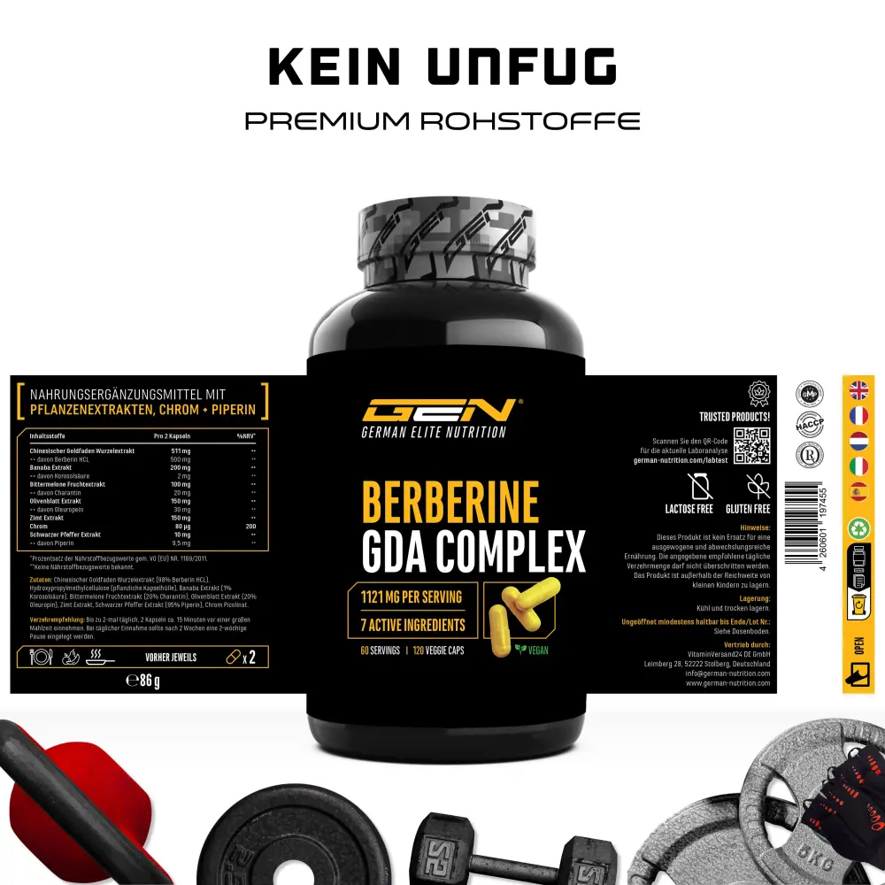 Chinesischer Goldfaden Wurzelextrakt (98% Berberin HCL), Überzugsmittel: Hydroxypropylmethylcellulose (pflanzlich), Banaba Extrakt (1% Korosolsäure), Bittermelone Fruchtextrakt (10% Charantin), Olivenblatt Extrakt (20% Oleuropin), Zimt Extrakt, Schwarzer Pfeffer Extrakt (95% Piperin), Chrom Picolinat.