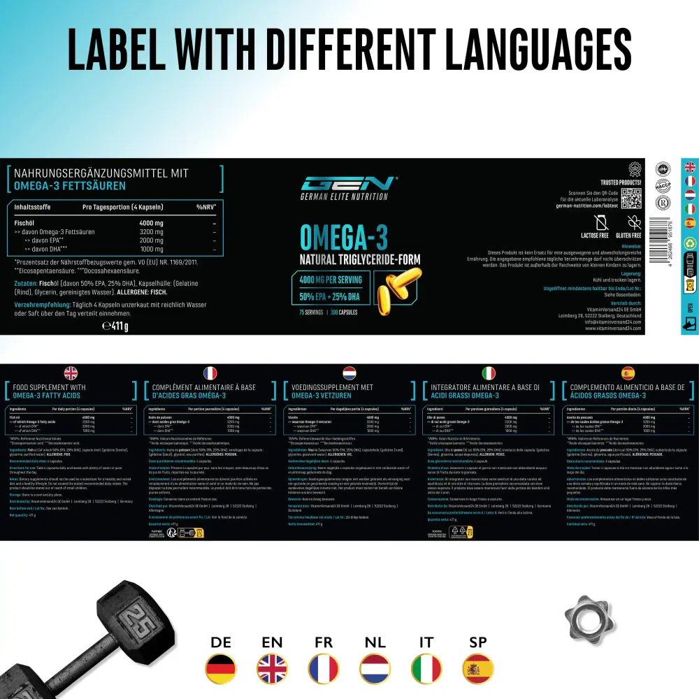 Jede Omega-3 Fischöl Kapsel liefert Dir 1000 mg Fischöl, davon 800 mg reines Omega-3, welches sich wiederrum in 500 mg EPA und 250 mg DHA aufglieder.