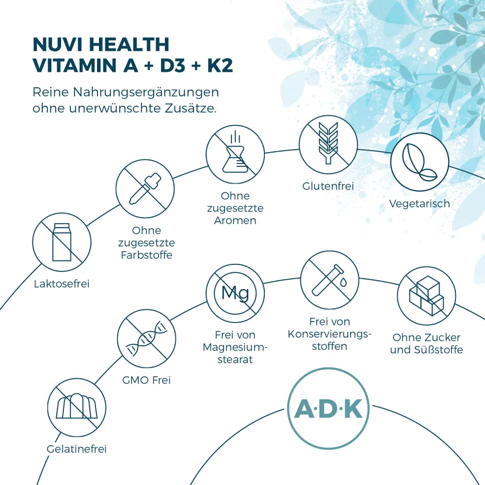 Premium Vitamin Komplex aus → Vitamin A (Retinol), → Vitamin D3 (Cholecalciferol aus Lanolin) und → Vitamin K2 (K2VITAL®, 99+% All-Trans).