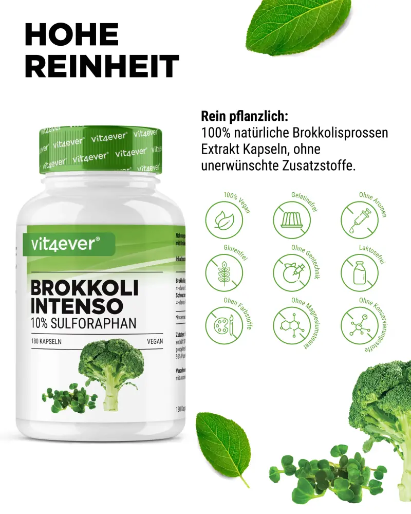 Brokkoli enthält natürliches Sulforaphan, einen sekundären Pflanzenstoff mit antioxidativen und antimikrobiellen Eigenschaften.